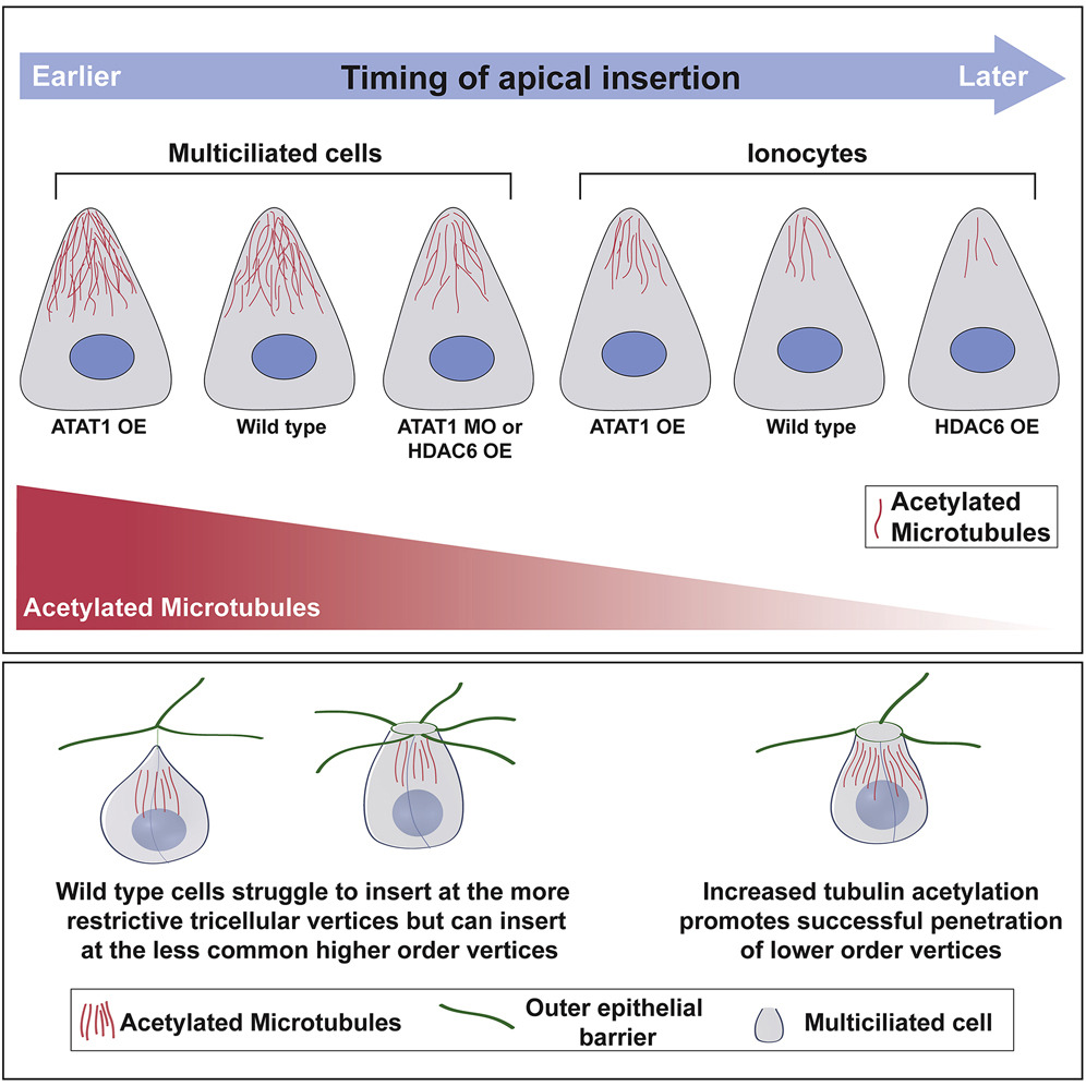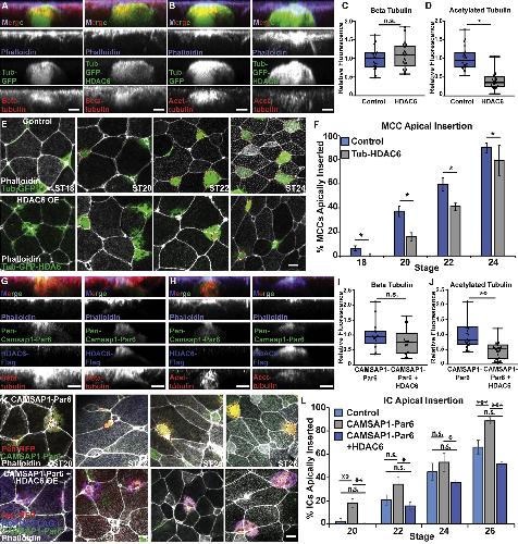 (A and B) Side projections of intercalating control and Tub-GFP-HDAC6 OE MCCs fixed and stained with phalloidin and α-beta tub (A) or α-acetylated (α-acetyl.) tub. (B).