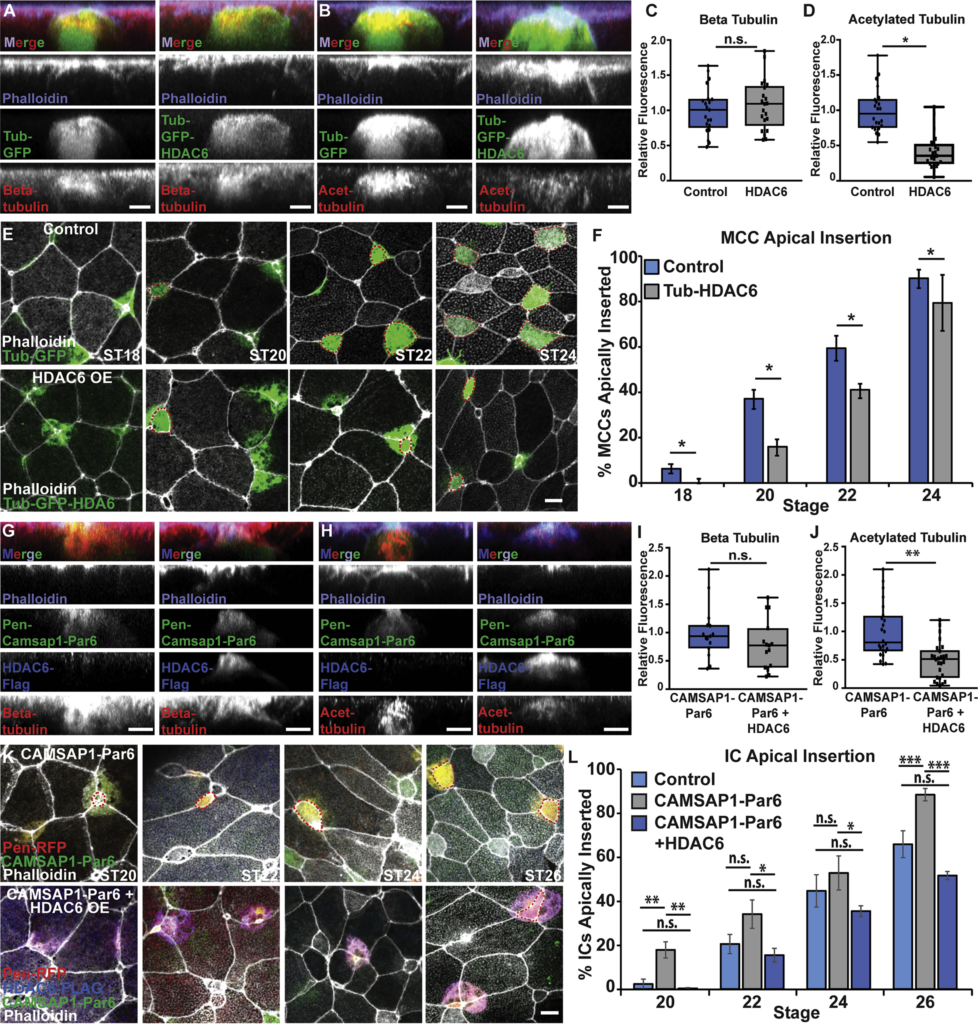 (G and H) Side projections of intercalating Pen-CAMSAP1-Par6 and Pen-CAMSAP1-Par6 + HDAC6 OE ICs stained with α-FLAG, phalloidin, and α-beta tub (G) or α-acetyl. tub (H).