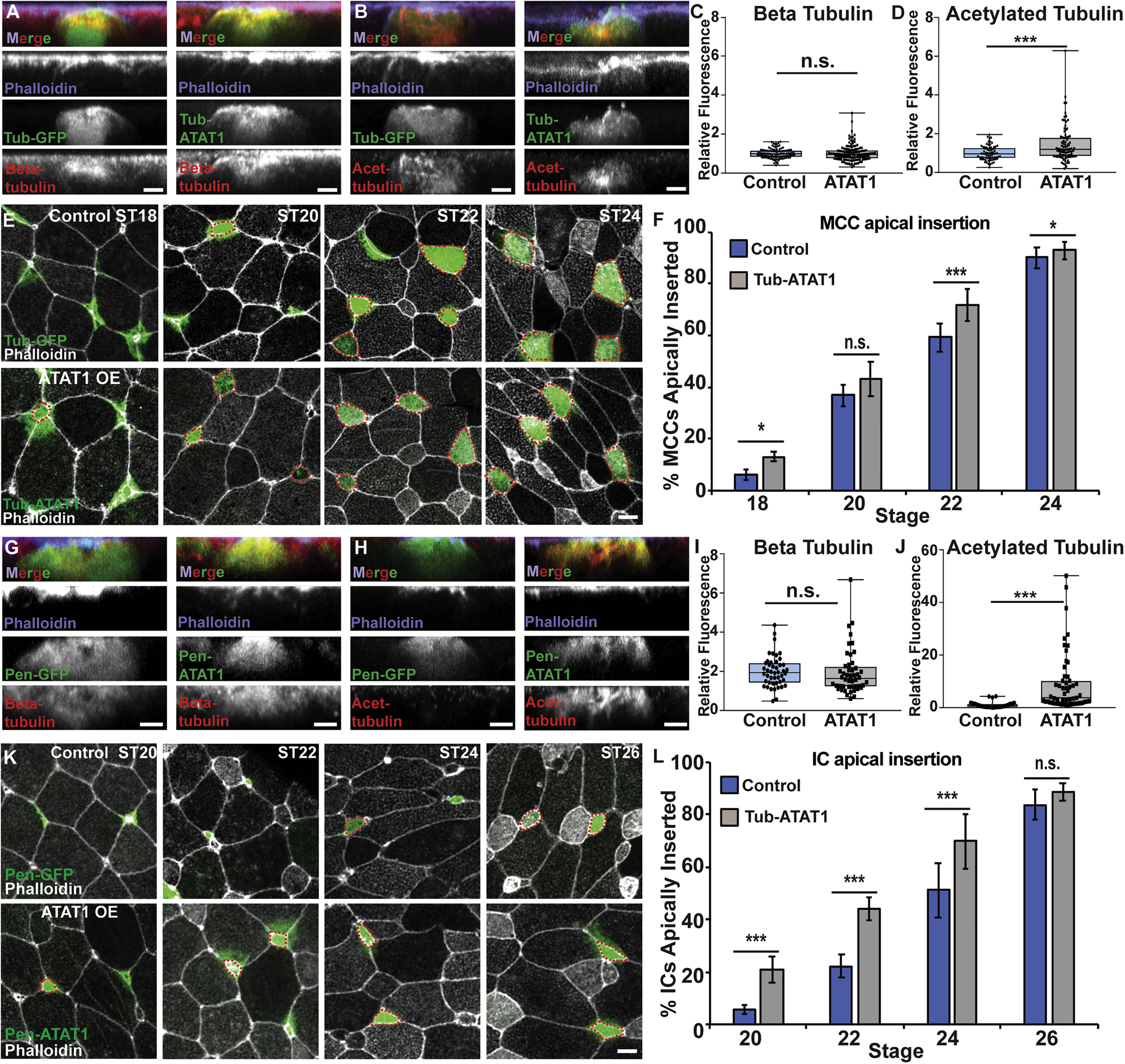 Figure 2. Increased MT acetylation results in precocious apical insertion(A and B) Side projections of intercalating control and ATAT1 OE MCCs fixed and stained with α-beta tub (A) or α-acetyl. tub (B).(C and D) Quantification of beta tub (C) and of acetyl. tub (D) in control and ATAT1 OE MCCs. Fluorescence was normalized relative to control (uninjected) MCCs in mosaic embryos for each experiment.(E) Z-projections displaying progression of MCC apical insertion in control (Tub-GFP) and ATAT1 OE embryos.(F) Quantification of the percentage of MCCs apically inserted at each stage.(G and H) Side projections of intercalating control and ATAT1 OE ICs fixed and stained with α-beta tub (G) or α-acetyl. tub (H).(I and J) Quantification of beta tub (I) and of acetyl. tub. (J) in control and ATAT1 OE ICs. Fluorescence was normalized relative to control (uninjected) ICs in mosaic embryos for each experiment.(K) Z-projections displaying progression of IC apical insertion in control (Pen-GFP) and Pen-ATAT1 OE embryos.(L) Quantification of the percentage of ICs apically inserted at each stage.For all bar graphs (F and L), bars represent the average and error bars indicate SD; for all box-and-whisker plots (C, D, I, and J), the box represents 25%â75% range, the line is the median, and the whiskers represent the total change; and *p < 0.05 and ***p < 0.001.Analysis includes n > 100 cells from at least 6 embryos per condition (C), n > 80 cells from at least 5 embryos per condition (D), n > 200 cells from at least 9 embryos per condition and ST (F), n > 15 cells from at least 3 embryos per condition (I), n > 50 cells from at least 5 embryos per condition (J), and n > 150 cells from at least 7 embryos per condition and ST (L). Scale bars in (A), (B), (G), and (H) represent 5 μm and in (E) and (L) represent 10 μm.