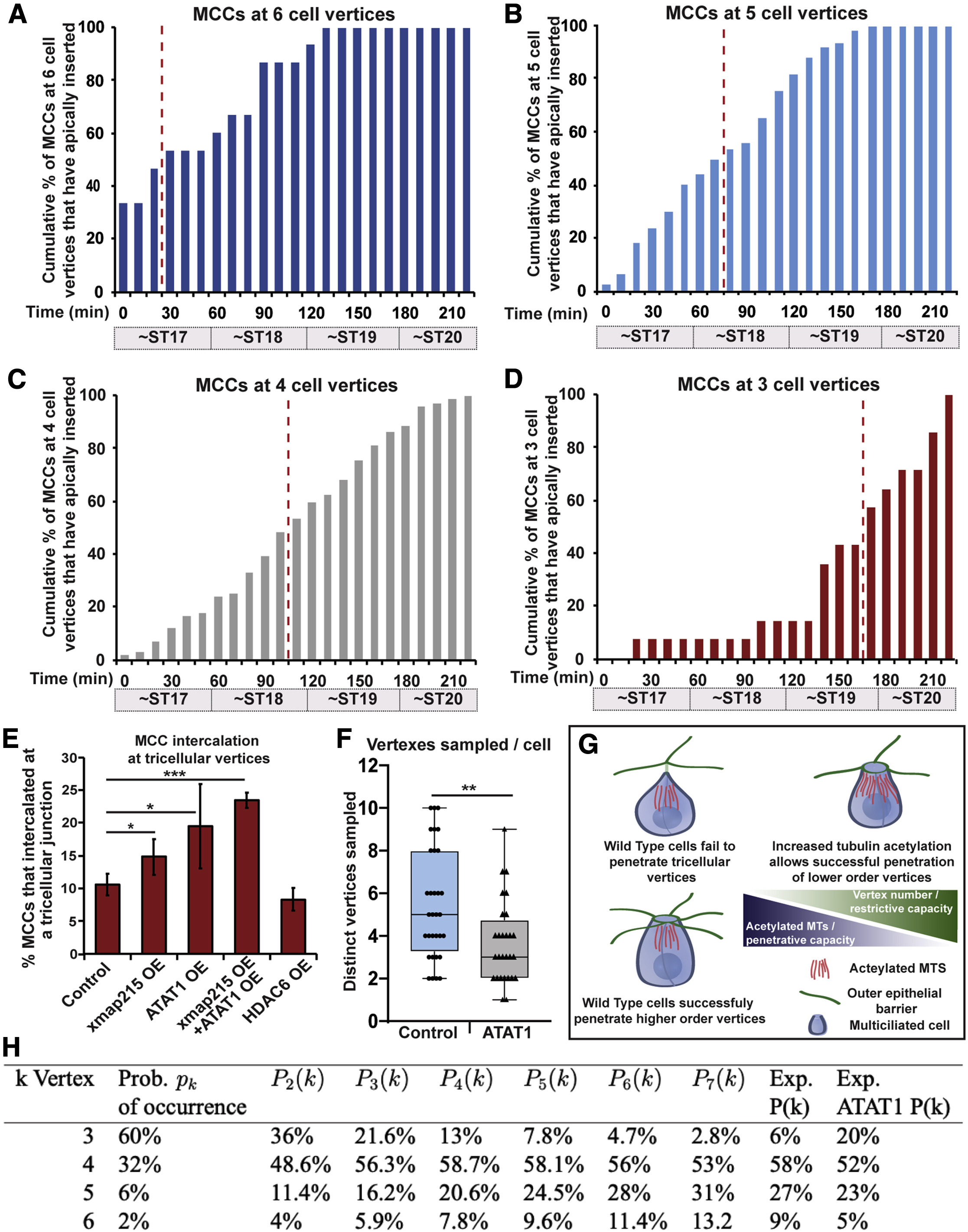Figure 4. Microtubule acetylation alters the penetrative capacity of MCCs(AâD) Quantification of cumulative percentages of MCCs inserting in the outer epithelium at 6-cell (A), 5-cell (B), 4-cell (C), and 3-cell vertices (D) over time. (AâD) Representative data generated from one time-lapse experiment analyzing intercalation of 214 MCCs. Similar trends were seen in other time-lapse videos. Percentages were calculated by dividing the cumulative number of total MCCs that had breached the outer epithelial layer at each time point by the number of MCCs that inserted at that vertex type. Red dotted line on each bar graph indicates the point at which 50% of the cells that would eventually intercalate at the vertex type had successfully breached the epithelium.(E) Quantification of the percentage of MCCs that intercalated at tricellular vertices by stage 20. For bar graph in (E), bars represent the mean, error bars indicate SD, and *p < 0.05 and ***p < 0.001. Analysis includes n > 350 cells for each condition from at least 9 embryos (E).(F) Measured value for q, quantification of the number of vertices sampled prior to apical insertion in control and ATAT1 OE MCCs. Data are from 2 4-h movies of each condition with an n of 32 cells for control and 28 cells for ATAT1 OE; for box-and-whisker plot, the box represents the 25%â75% range, the line represents the median, and the whiskers represent the total range; and **p < 0.01.(G) Model of the balance of the restrictive capacity of the epithelium that varies by vertex strength and the penetrative capacity of intercalating cells that varies by the amount of tubulin acetylation.(H) Probability that an MCC successfully intercalates at a k-vertex, using Equation 1. Experimental data (Exp. P(k) column) is from Figure 3B (right). Distribution of vertex type (Prob. of occurrence column) is from Figure 3B (left). Exp. ATAT1 P(k) represents the observed percentage for each vertex type in MCC OE ATAT1. This table shows the dependence on q of the probability that an MCC successfully intercalates at a k-vertex, using Equation 1.