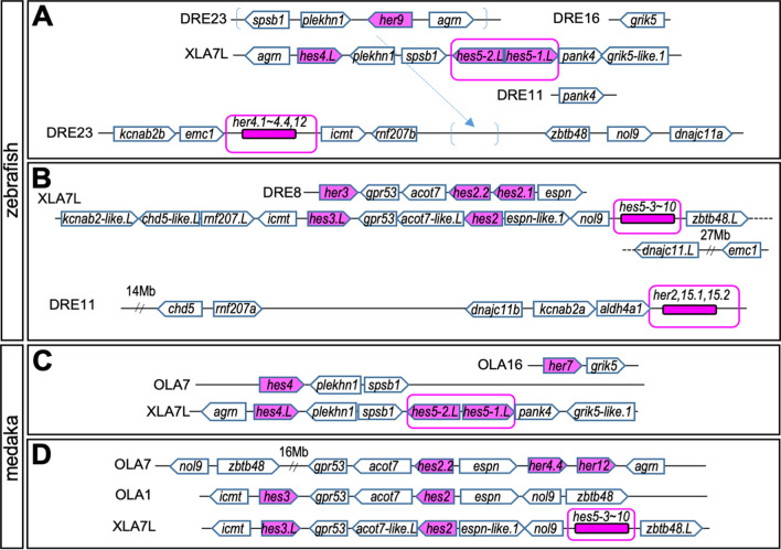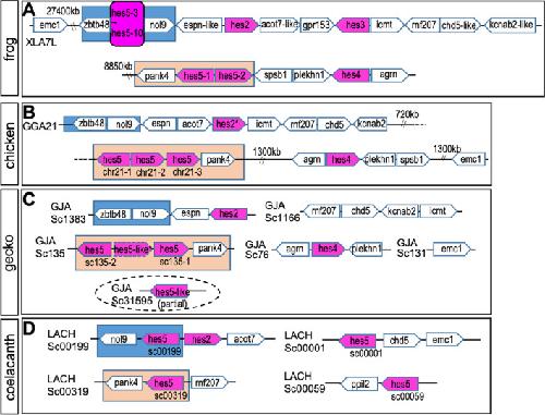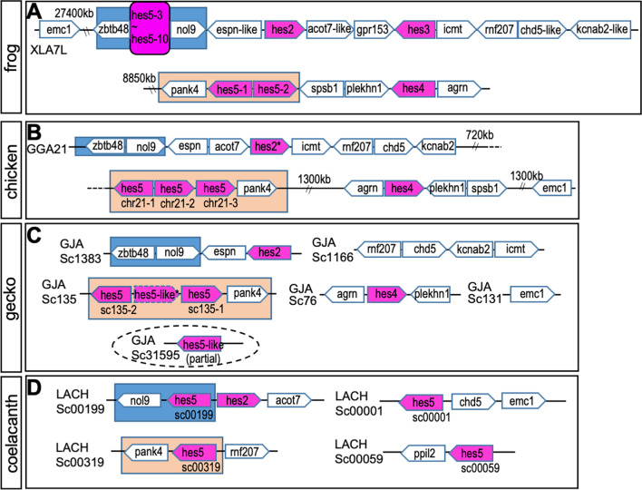 Fig. 2. Syntenic analysis of hes gene locus in sarcopterygian. The syntenies in frog (A), chicken (B), gecko (C) and coelacanth (D) are shown. Chromosome number is described as “XLA7L” in each panel. Pentagon arrows show genes with the 5′–3′ direction. Magenta shows hes gene and magenta with a broken line indicates a pseudogene. Orange or blue squares show the hes5.1 and hes5.3 cluster region, respectively. The broken lined circle shows “partial” hes gene