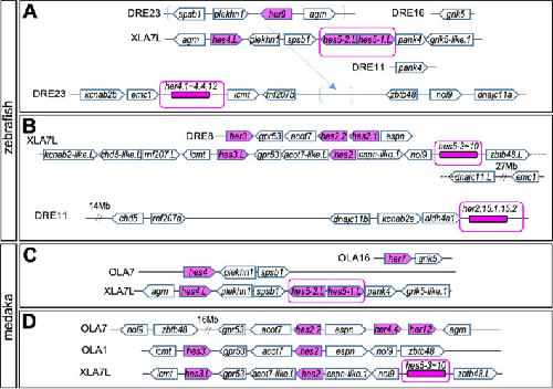 Fig. 4. Comparison with hes gene locus among Xenopus, zebrafish and medaka. Chromosome number is described as “DRE23”. Pentagon arrows show genes a gene with 5′–3′ direction. Magenta shows hes gene. Broken arrow means same region (on DRE23). DRE, zebrafish; OLA, medaka; XLA, Xenopus laevis