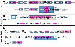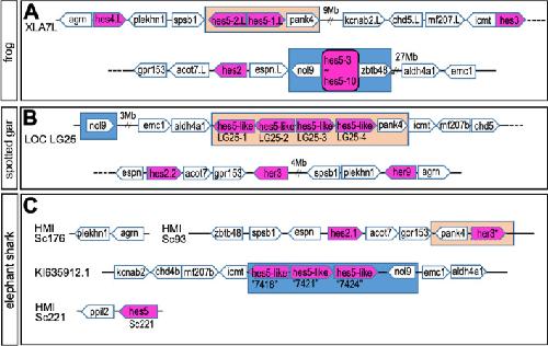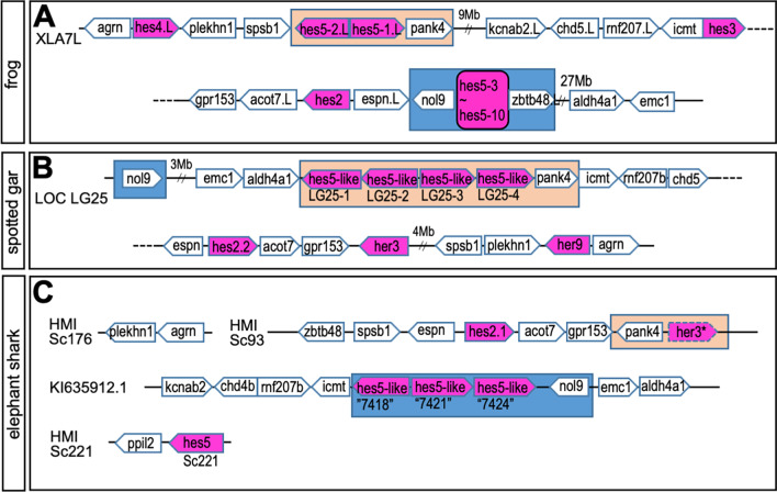 Fig. 6. Comparison with hes gene locus among Xenopus (A), spotted gar (B) and elephant shark (C). Pentagon arrows show genes with the 5′–3′ direction. Magenta shows hes gene and magenta with a broken line is a pseudo gene. Orange square shows the hes5-1 cluster region. Orange and blue square shows the hes5.1 and hes5.3 cluster region, respectively