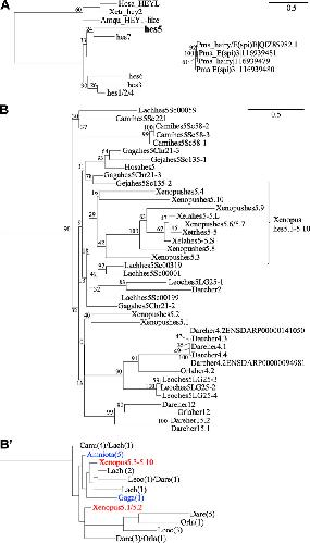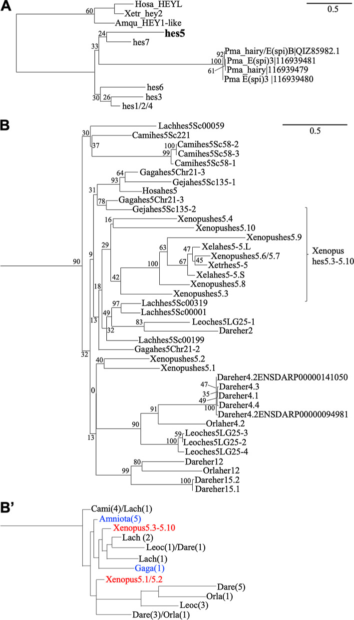Fig. 7. Comprehensive phylogenetic analysis of hes genes except for hes5 (A) and hes5 genes (B) in jawed vertebrate. Evolutionary analysis was conducted in RAxML. Human HEYL, X.tropicalis hey2 and sponge (Amphimedon queenslandica) HEY1-like gene sequences were used as an outgroup. The outline of B is described in B’. Hosa, human; Mumu, Mouse; Gaga, Chicken; Geja, Japanese gecko; Xetr, Xenopus tropicalis; Lach, Coelacanth; Dare, zebrafish; Orla, medaka; Leoc, spotted gar; Cami, elephant shark; Amqu, sponge