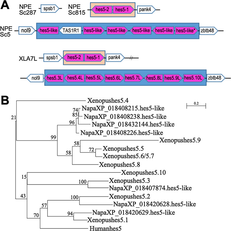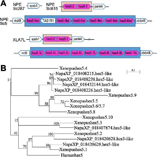 Fig. 8. Syntenic and phylogenetic analysis of Tibetan frog hes5 genes. A Synteny analysis around hes5 locus in Xenopus laevis and Nanorana parkeri. *: the gene lacks WPRW motif (the gene was deleted from the following phylogenetic analysis (B)). B Phylogenetic tree analysis of hes5 genes of Xenopus laevis, Xenopus tropicalis and Nanorana parkeri. The phylogenetic tree was constructed by ML method