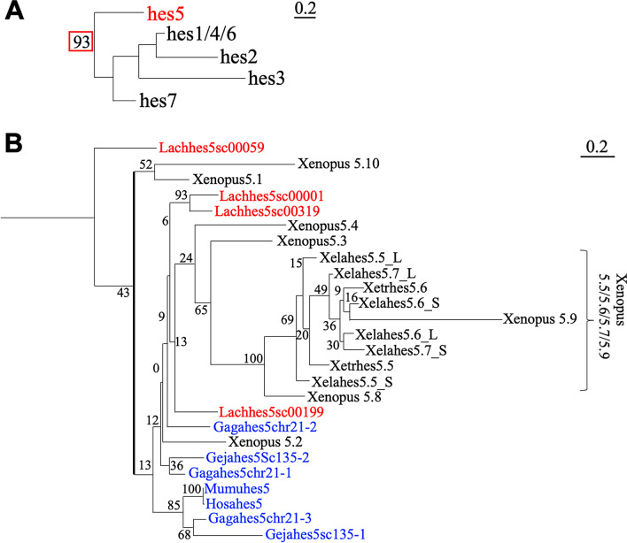 Fig. 1. Phylogenetic analysis of hes genes in sarcopterygian. A The outline of phylogenetic tree in hes gene family. B The phylogenetic tree was constructed based on the amino acid sequences using the ML method. Bootstrap values for nodes are indicated (n = 100). Evolutionary analysis was conducted in RAxML. Blue and red letters indicate amniote and coelacanth genes, respectively. The abbreviation of animals are as follows: Hosa; human, Mumu; Mouse, Gaga; Chicken, Geja; Japanese gecko, Xetr; X. tropicalis, Xela; X. laevis, Lach; Coelacanth