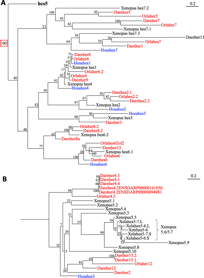 Fig. 3. Phylogenetic analysis of teleost hes genes. The phylogenetic tree was constructed by ML method. hes genes except for hes5 (A), only hes5 genes (B). Red and blue letters indicate zebrafish/medaka and human hes genes, respectively. Hosa, human; Xela, Xenopus laevis; Xetr, Xenopus tropicalis; Dare, zebrafish; Orla, medaka