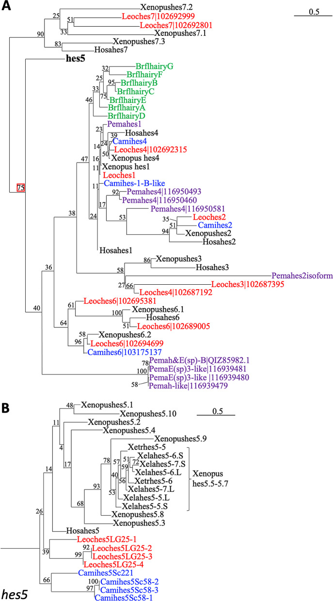 Fig. 5. Phylogenetic analysis of hes genes of several jawed vertebrates. The phylogenetic tree was constructed by ML method. hes genes except for hes5 (A), hes5 genes (B) of spotted gar, elephant shark, lamprey and amphioxus. Blue, red, purple and green letters indicate spotted gar, elephant shark, lamprey and amphioxus, respectively. Hosa, human; Xetr, Xenopus tropicalis; Leoc, spotted gar; Cami, elephant shark; Pema, lamprey; Brfl, amphioxus