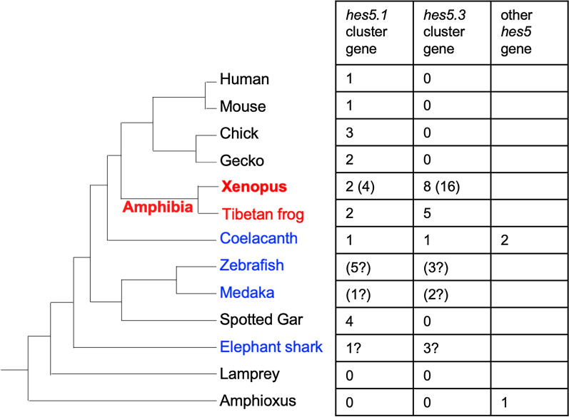 Fig. 9. Evolutionary acquisition of hes5 genes and the hes5 cluster. Phylogenetic tree of jawed vertebrate (left). The table shows the number of hes5 genes that were classified to the hes5.1 or hes5.3 cluster and the number of hes5 genes that were not classified to the two clusters. The phylogenetic analysis was conducted using full-length amino acid sequences