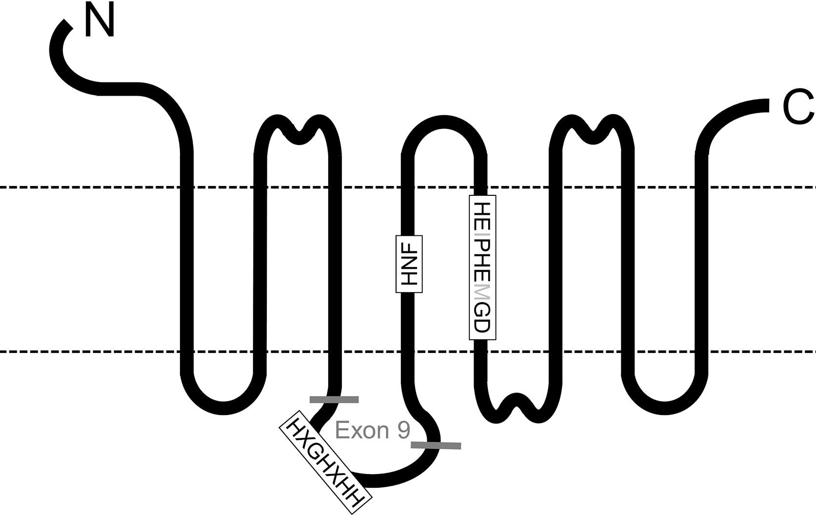 Fig. 1. Topology of human ZIP12. N and C indicate N-terminus and C-terminus, respectively. Dashed lines indicate transmembrane domains. Inclusion of exon 9, marked in gray, results in a splice variant with a longer cytoplasmic loop containing a histidine-rich region (motif HXGHXHH, X indicates amino acids not conserved across mammals). Motifs HNF and HEIPHEMGD in transmembrane regions 4 and 5 are fully conserved across different vertebrates and largely conserved across ZIP proteins. Amino acids in light gray are partially conserved between human ZIP4.