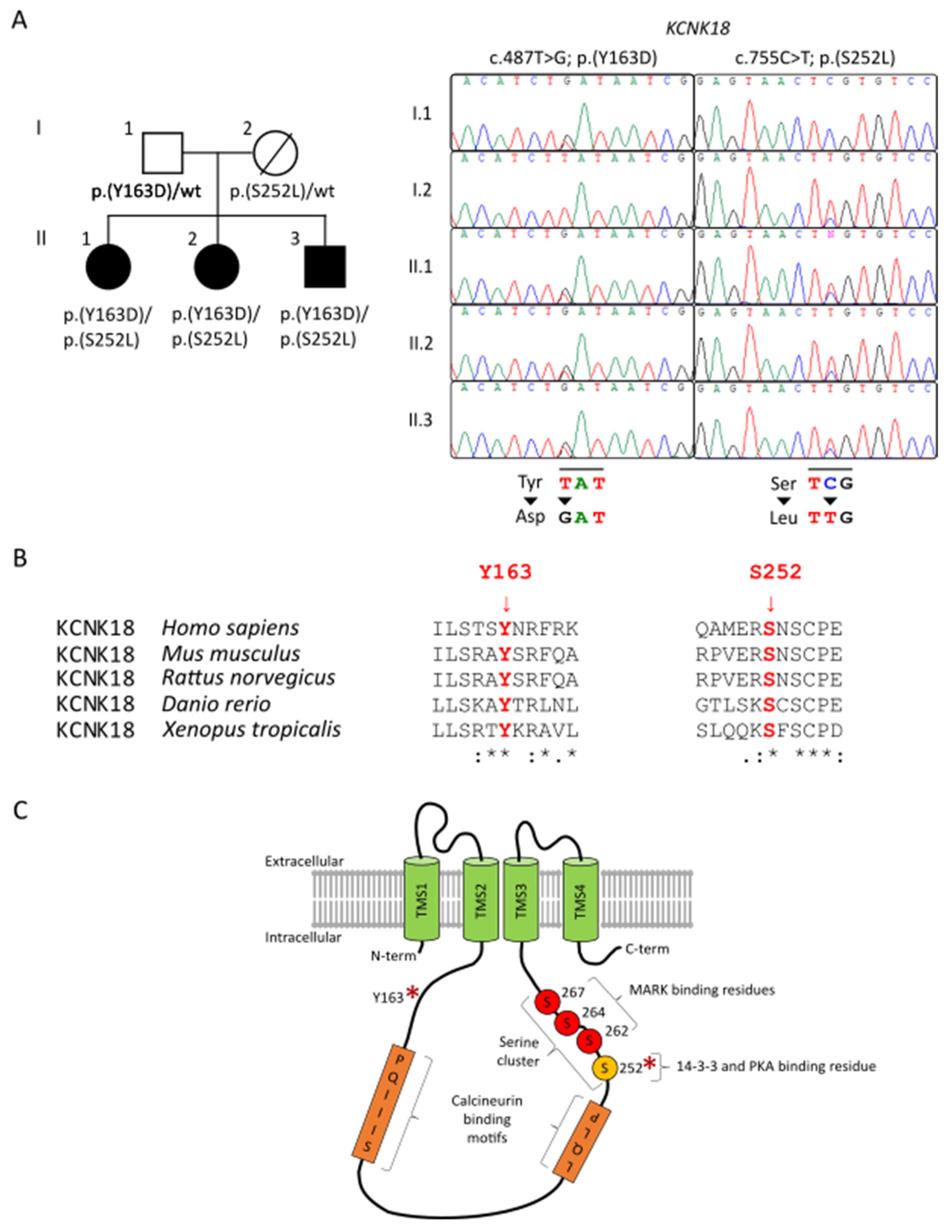 Figure 1. Pedigree, conservation, and graphical representation of the KCNK18 variants. (A). Pedigree of the family and Sanger sequencing chromatograms documenting co-segregation between compound heterozygosity for the two missense changes in KCNK18 and clinical traits transmitted in the family. (B). Multiple alignments of the amino acid stretches flanking the affected residues in TRESK orthologs showing conservation of both mutated residues (in red). Residues are referred to human KCNK18, NM_181840.1. (C). Schematic topology of the human K2P TRESK channel, showing location of Tyr163 (Y163) and Ser252 (S252) (red asterisks). Human TRESK is composed of 384 amino acid residues and shows the most characteristic features of K2P channels, including four transmembrane helices, two pore-forming domains, and intracellular N- and C-termini. A peculiar structural feature of TRESK (compared to other K2P channels) is the long intracellular loop between the second and third transmembrane segments (TMS), and the relatively short C-terminal tail [3]. In the image, representative domains are shown: PQIIIS and LQLP are calcineurin-binding motifs [5,17], while the serine cluster and Ser252 are indicated by the letter S and are, respectively, MARK kinases and 14-3-3 and PKA binding motifs.