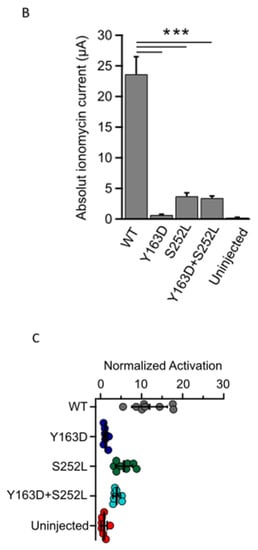 Figure 3. KCNK18 p.Tyr163Asp and p.Ser252Leu impair the ionomycin-induced activation of TRESK channels. Representative data points showing ionomycin activation of TRESK WT, Y163D, S252L and Y163D + S252L currents as well as endogenous currents from un-injected oocytes. (B). Bar graph showing the mean of ionomycin activated currents (*** p < 0.001). All the groups were statistically significant compared to the uninjected group (WT vs. uninjected p < 0.001; Y163D vs. uninjected p = 0.02; S252L and Y163D + S252L vs. uninjected p < 0.01; n = 12). (C). Each point represents the steady state ionomycin activated current divided by the steady-state basal current (IIono/IBasal) recorded in the presence of 80 mM extracellular K+.