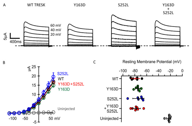 Figure 2. p.Tyr163Asp and p.Ser252Leu do not significantly affect the basal current and ability of TRESK channels to control the cell’s resting potential. (A). Representative families of current traces for the indicated channel types. Cell membrane potential was held at −80mV. Each family of currents was evoked by voltage steps from −120 mV to 60 mV, with 20 mV increments. The recordings were performed 48 h after the injection of 1 ng of mRNA for each channel type. (B). Average IV relationships calculated from experiments as in A for the labelled channel types (color coded). The data points are mean ± standard error (0.001; n = 12). (C). Resting membrane potentials from individual oocytes un-injected (grey dots), injected with 1 ng of WT (black dots) or Y163D (green dots) or S252L (blue dots) or 0.5 ng of each Y163D and S252L (red dots) mRNA and recorded 48 h after injection. Note that the expression of all channel types similarly shifts the resting potential toward K+ reversal potential. The dots in C represent single cell recordings. The data are mean ± standard deviation.