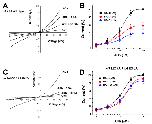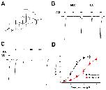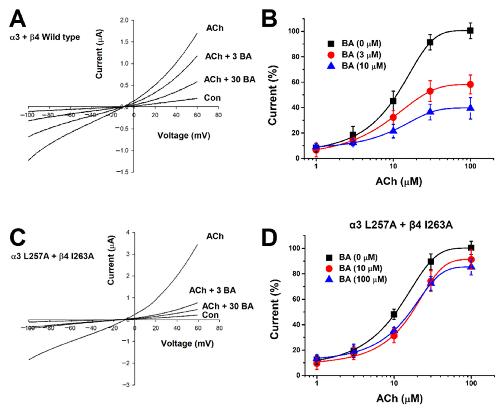 Confirmation of α3β4 nAChRs current-voltage relationship and non-competitive action of BA. (A) Confirmation of the interaction between the response of α3β4 nAChRs and different concentrations of BA using a voltage ramp protocol from â100 to +60 mV. The membrane holding potential was â80 mV. The applied ACh concentration was fixed at 100 μM (n = 8â10 from four different frogs). (B) After applying various concentrations of ACh, induced internal current and non-competitive action of BA were observed. The concentration of BA applied was 3 μM (â) or 10 μM (â²). The holding potential of the oocyte voltage-clamp was â80 mV. Each point represents mean ± SEM (n = 7â9/group). (C) Double-mutant α3β4 nAChRs (α3: L257A, β4: I263A) and the application of different concentrations of BA using a voltage ramp protocol from â100 to +60 mV. The membrane holding potential was â80 mV. The applied ACh concentration was fixed at 100 μM (n = 7â9 from five different frogs). (D) Applying various concentrations of ACh and BA to double-mutant α3β4 nAChRs (α3: L257A, β4: I263A). The concentration of BA applied was 10 μM (â) or 100 μM (â²). The holding potential of the oocyte voltage-clamp was â80 mV. Each point represents mean ± SEM (n = 7â9/group).