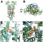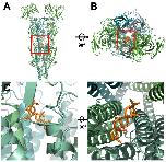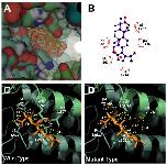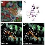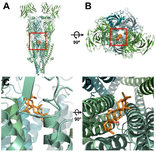 Figure 3. Molecular interaction of BA based on the docking model of α3β4 nAChRs in 3D structure. (A–D) A view of the BA interaction site on α3β4 nAChRs from the side and top. This structure was constructed based on the structure shown in the protein data bank (PDB) (ID 5T90).