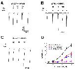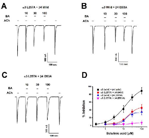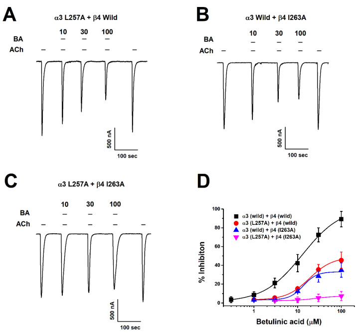 Figure 5. Inhibition of BA by α3β4 nAChRs mutant types. (A–C) Concentration-response of inward current depending on mutant type. ACh and BA were co-applied. The applied ACh concentration was fixed at 100 μM while BA concentrations included 10, 30, and 100 μM (n = 7–10 from four different frogs). (D) Graph represents the inhibition of BA activity by mutant type at various concentrations. Each point is presented as mean ± SEM (n = 7–9/group). Detailed values are shown in Table 1.