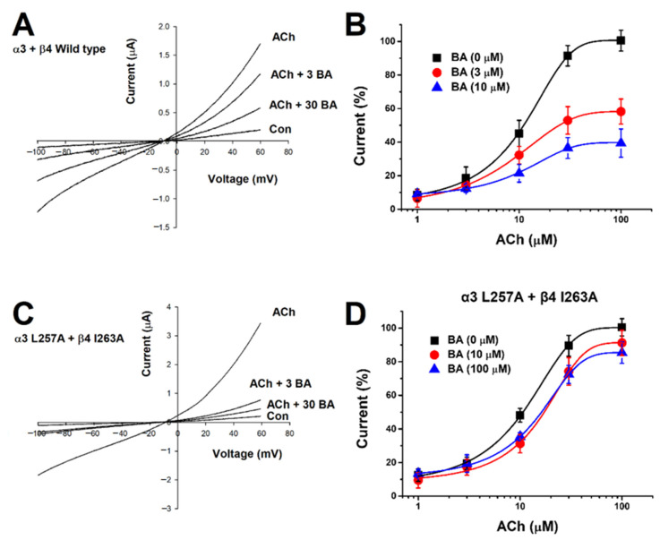 Figure 2. Confirmation of α3β4 nAChRs current-voltage relationship and non-competitive action of BA. (A) Confirmation of the interaction between the response of α3β4 nAChRs and different concentrations of BA using a voltage ramp protocol from −100 to +60 mV. The membrane holding potential was −80 mV. The applied ACh concentration was fixed at 100 μM (n = 8–10 from four different frogs). (B) After applying various concentrations of ACh, induced internal current and non-competitive action of BA were observed. The concentration of BA applied was 3 μM (●) or 10 μM (▲). The holding potential of the oocyte voltage-clamp was −80 mV. Each point represents mean ± SEM (n = 7–9/group). (C) Double-mutant α3β4 nAChRs (α3: L257A, β4: I263A) and the application of different concentrations of BA using a voltage ramp protocol from −100 to +60 mV. The membrane holding potential was −80 mV. The applied ACh concentration was fixed at 100 μM (n = 7–9 from five different frogs). (D) Applying various concentrations of ACh and BA to double-mutant α3β4 nAChRs (α3: L257A, β4: I263A). The concentration of BA applied was 10 μM (●) or 100 μM (▲). The holding potential of the oocyte voltage-clamp was −80 mV. Each point represents mean ± SEM (n = 7–9/group).