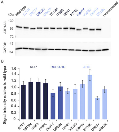 Fig. 1. Variations in the expression of ATP1A3 with different AHC and RDP mutations in HEK cells. (A) Example of western blot demonstrating the ATP1A3 (~112 kDa) and GAPDH (~37 kDa) bands for all constructs examined in this study. (B) Quantitative analysis of band intensities relative to wild type, averaged over 7 repetitions (mean ± SEM). Differences in the expression were significant within the AHC mutations group (one way ANOVA, p = .0045), but not within the RDP group (p = .95).