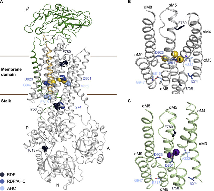 Fig. 3. Crystal structures of the Na+/K+ -ATPase heterotrimer. (A) The [Na3]E1P-ADP state (PDB ID 3WGV) with the location of the residues studied here. The Na+ ions are shown as yellow spheres. (B) Close up view of Na+ binding sites. (C) Close up view of K+ (Rb+) binding sites in the [Rb2]E2-Pi (PDB ID 3KDP) crystal structure. Rb+ ions are depicted as purple spheres. Figure was created using PyMOL (The PyMOL Molecular Graphics System, Version 2.3.0 Schrödinger, LLC). (For interpretation of the references to colour in this figure legend, the reader is referred to the web version of this article.)