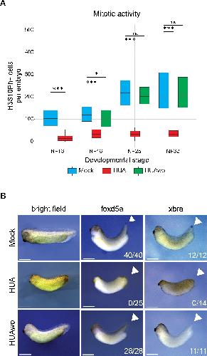 Fig 5. The HUA effects on embryogenesis are reversible. Embryos, which were transiently incubated in HUA solution and thus mitotically arrested, were returned to Mock solution at NF13. (A) Abundance of mitotic cells in Mock, HUA-treated, and HUAwo embryos. Box plots based on H3S10Ph-positive cells present on the recorded surface of embryos, displayed in S5 Fig (n ⥠3 biological replicates/condition; Student t test [unpaired, two-tailed]; *** p < 0.001; * p < 0.05; n.s., not significant). The individual quantitative observations can be found in S3 Data. (B) Morphological and molecular features of embryos at the early tadpole stage. In contrast to continuous HUA-treated embryos, HUAwo embryos regain eye cups, fin, and tailbud structures. In addition, they express foxd5a and xbra mRNAs in the growth zone of the tailbud, comparable to Mock embryos. Numbers indicate embryos positive for the marker over the total number of analyzed embryos (n = 3 biological replicates/condition). Scale bars: 1 mm. HUA, hydroxyurea and aphidicolin; HUAwo, HUA washout. https://doi.org/10.1371/journal.pbio.3001377.g005 |