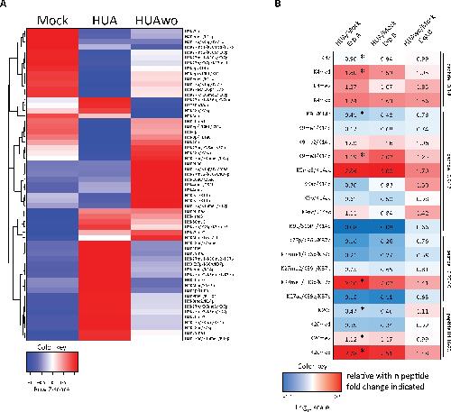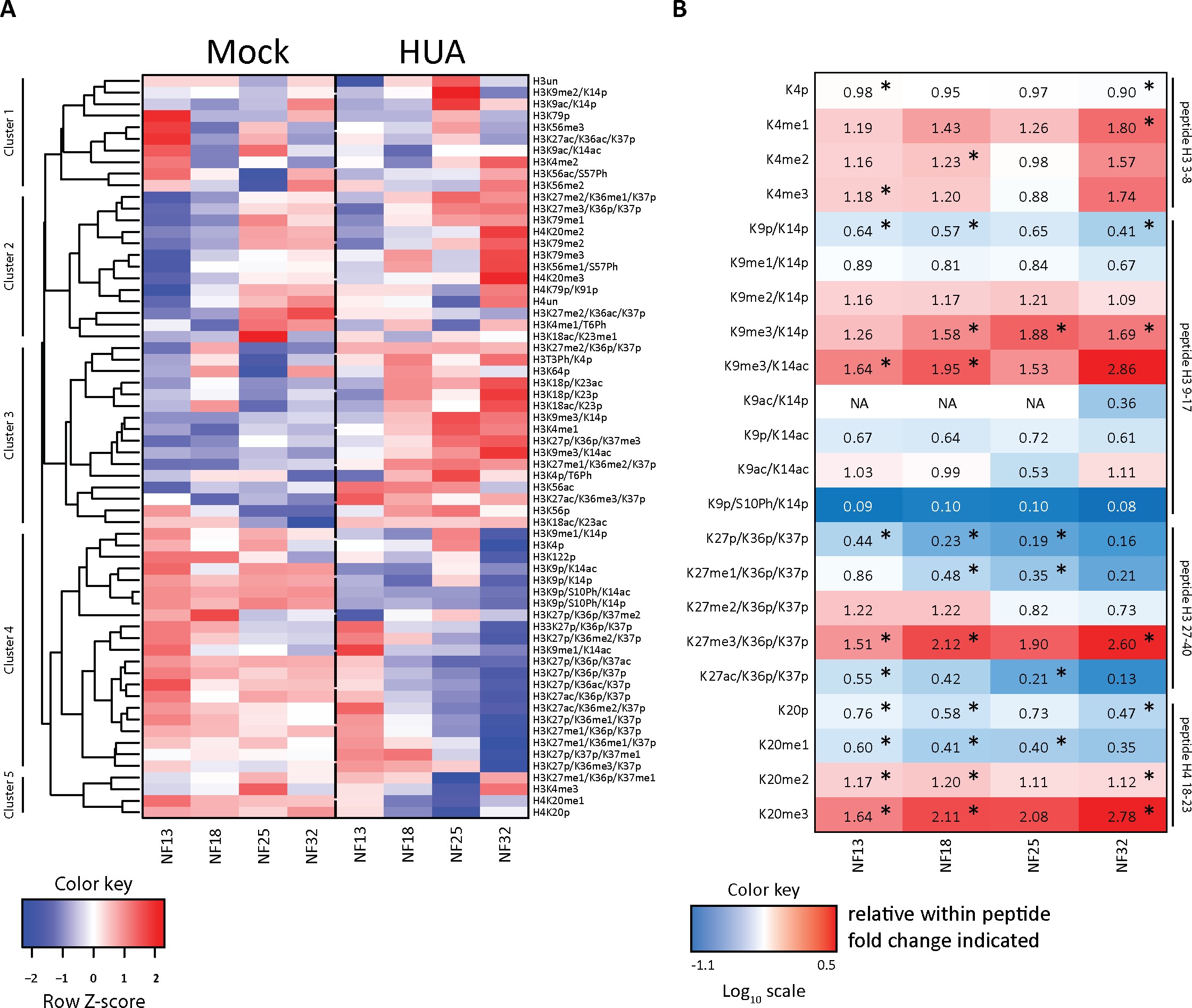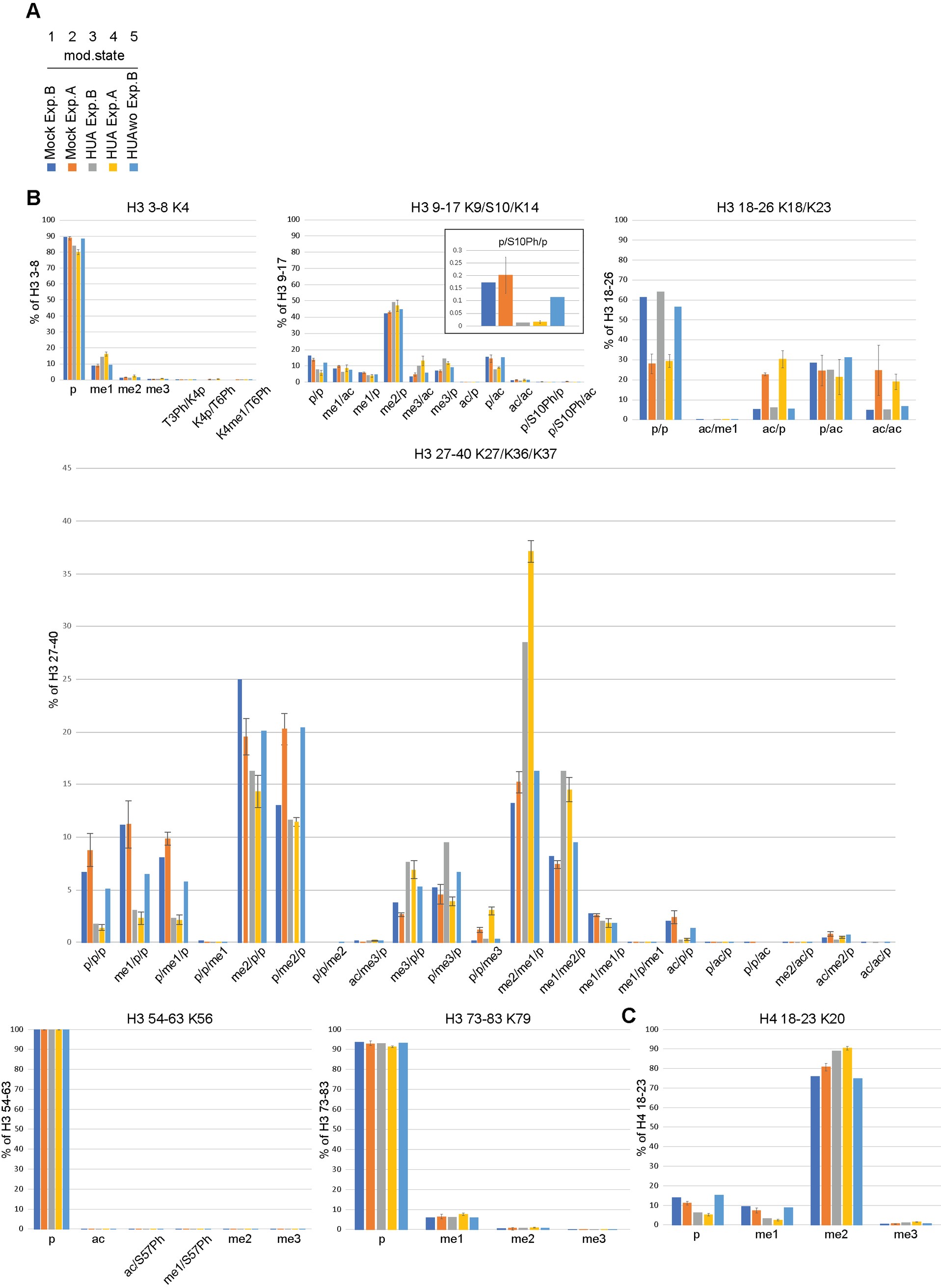 Fig 6. HUA effects on stage-specific HMPs are reversible. (A) Heatmap of the relative histone modification states abundance under the indicated conditions. As before, the relative distributions of the indicated modification states are calculated in percentages within each tryptic peptide. Data in columns are collected from early tadpole stage embryos NF32 (n = 1 biological replicate), independently from the data of experiment type A. Note: Relative differences between Mock and HUA samples of experiment type B are highly similar to the results of experiment type A (S6 Fig). Color key, row Z-score. The individual quantitative observations can be found in S4 Data. (B) Ratio heatmap of relative histone modification abundance for selected histone marks. First, the relative distributions of the indicated modification states are calculated as percentages within each tryptic peptide (S6 Fig). Then, the relative values are presented as ratios between sample pairs indicated on top, showing the relative change for each histone modification state between the 2 conditions. Color key is based on the Log10 scale. Numerical values in the cells indicate the fold-change. âp,â propionylated (naturally unmodified). Values greater than 1.0 indicate an increase in HUA condition; values smaller than 1.0 indicate a higher abundance in Mock condition. NA, not applicable, when values in Mock were 0. The first 2 columns illustrate the similarity between experiment types A and B; the information in the third column shows the similarity between HUAwo and Mock samples. Asterisks (*), adj.p < 0.1 (BenjaminiâHochberg procedure) between indicated conditions. The direct comparison of relative histone PTMs abundance is shown in S6 Fig. HMP, histone modification profile; HUA, hydroxyurea and aphidicolin; HUAwo, HUA washout. https://doi.org/10.1371/journal.pbio.3001377.g006 |