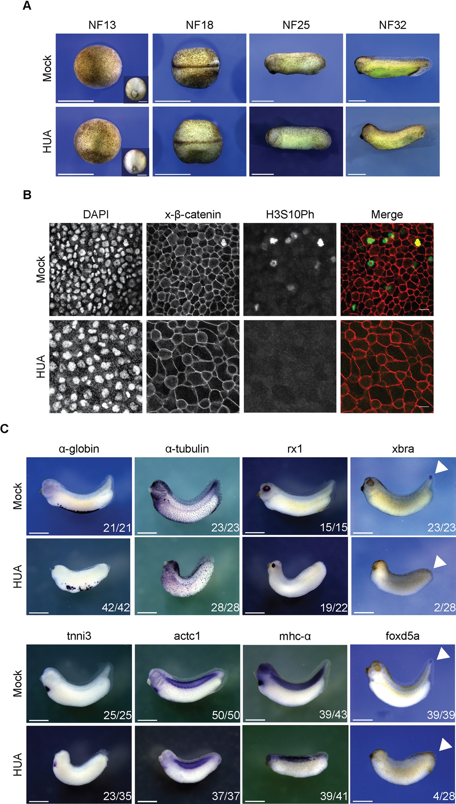 Fig 3. Morphological development of HUA-arrested embryos. (A) During gastrulation, Mock and HUA embryos are indistinguishable. At NF18, the latter show a delay in neural tube closure. More severe malformations are detectable at stages NF25 and NF32, most notably reduced eye formation and absence of tail bud. Scale bars: 1 mm. (B) Cell size at the tailbud stage. Flattened Z-stack images show fields from embryonic skin at constant magnification (scale bars: 20 μm). Immunofluorescence detects cell borders (beta-catenin), nuclei (DAPI), and mitotic cells (H3S10Ph). GIFs from Z-stacks are presented in the Supporting information (S1 and S2 Videos). (C) Whole mount RNA in situ hybridization for indicated marker genes. Images are representative for the majority of Mock- or HUA-treated embryos from 3 biological experiments. While mRNAs of α-tubulin and rx1 (skin, neuronal), α-globin, tnni3, actc1, and mhc-α (mesodermal) are detected in both conditions, xbra and foxd5a (tail blastema) are absent in HUA embryos. Numbers indicate embryos positive for the marker over the total number of analyzed embryos. Scale bars: 1 mm. HUA, hydroxyurea and aphidicolin. https://doi.org/10.1371/journal.pbio.3001377.g003 |
