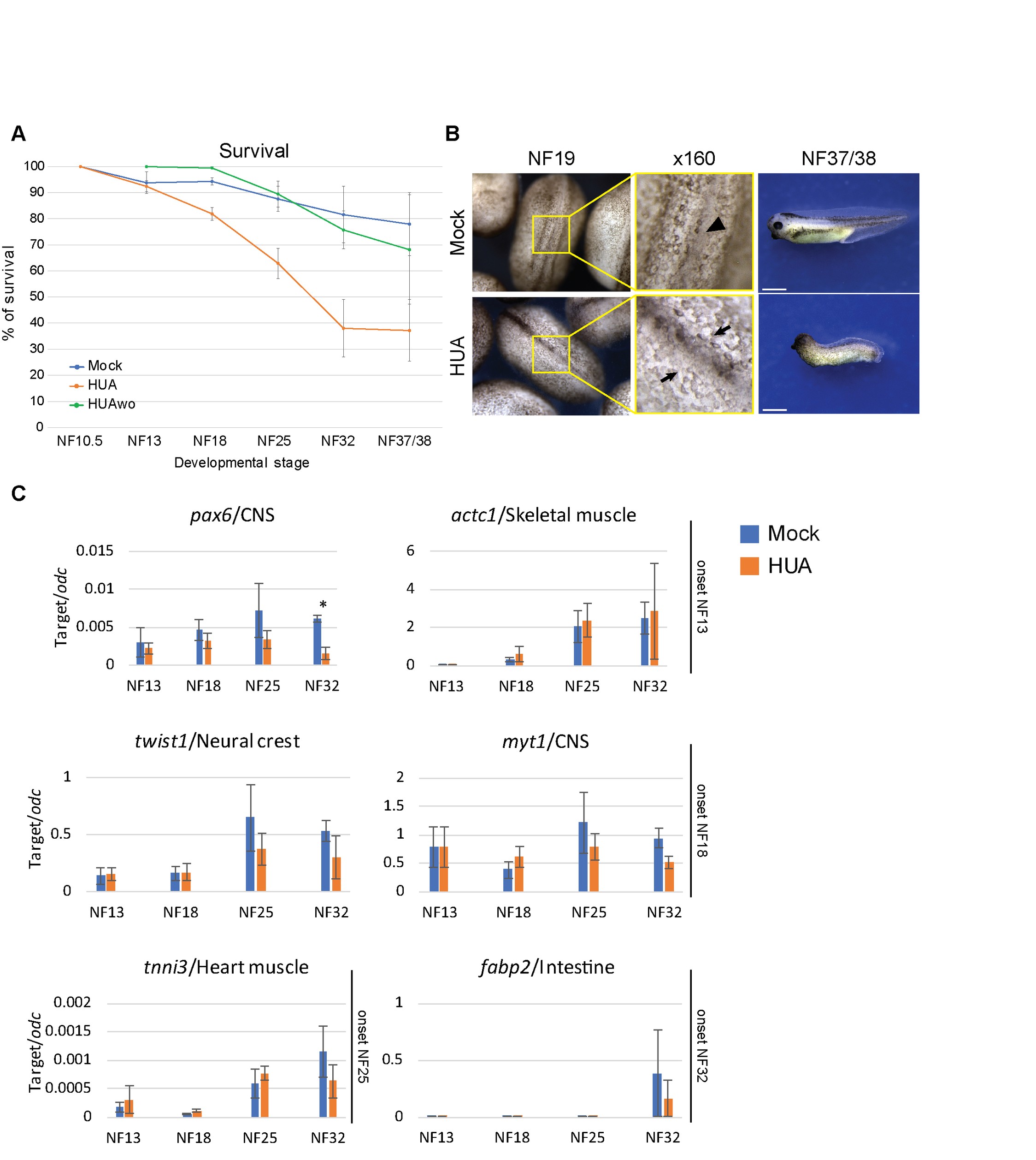 S1 Fig. HUA treatment reduces survival and impacts morphogenesis. (A) Embryonic survival curves under Mock, HUA, or HUAwo condition. Data from n ⥠3 biological replicates/condition; mean ± SEM. The individual quantitative observations can be found in S5 Data (sheet 1). (B) The first morphological effect of HUA treatment is apparent at stage NF19 as a delay in neural tube closure (in mock, black arrowhead points to the dorsal midline; in HUA, 2 black arrows point to separate neural folds). Under higher magnification, HUA embryos contain larger cells. After hatching (stage NF37/38), HUA-treated embryos lack tails, have reduced eyes and malformed fins, and are largely deficient in melanocytes. (C) Comparison of temporal expression profiles for selected marker genes in Mock and HUA conditions by qRT/PCR, normalized to odc mRNA. Genes are grouped according to their activation time point. N = 3 biological replicates/condition; mean ± SEM. Significant difference was detected only in case of pax6 expression level at NF32 stage (Student t test [two-tailed, paired]; * p < 0.05). No other significant differences were detected between the 2 conditions. The individual quantitative observations can be found in S5 Data (sheet 2). CNS, central nervous system; HUA, hydroxyurea and aphidicolin; HUAwo, HUA washout; qRT/PCR, quantitative real-time polymerase chain reaction. https://doi.org/10.1371/journal.pbio.3001377.s001 |