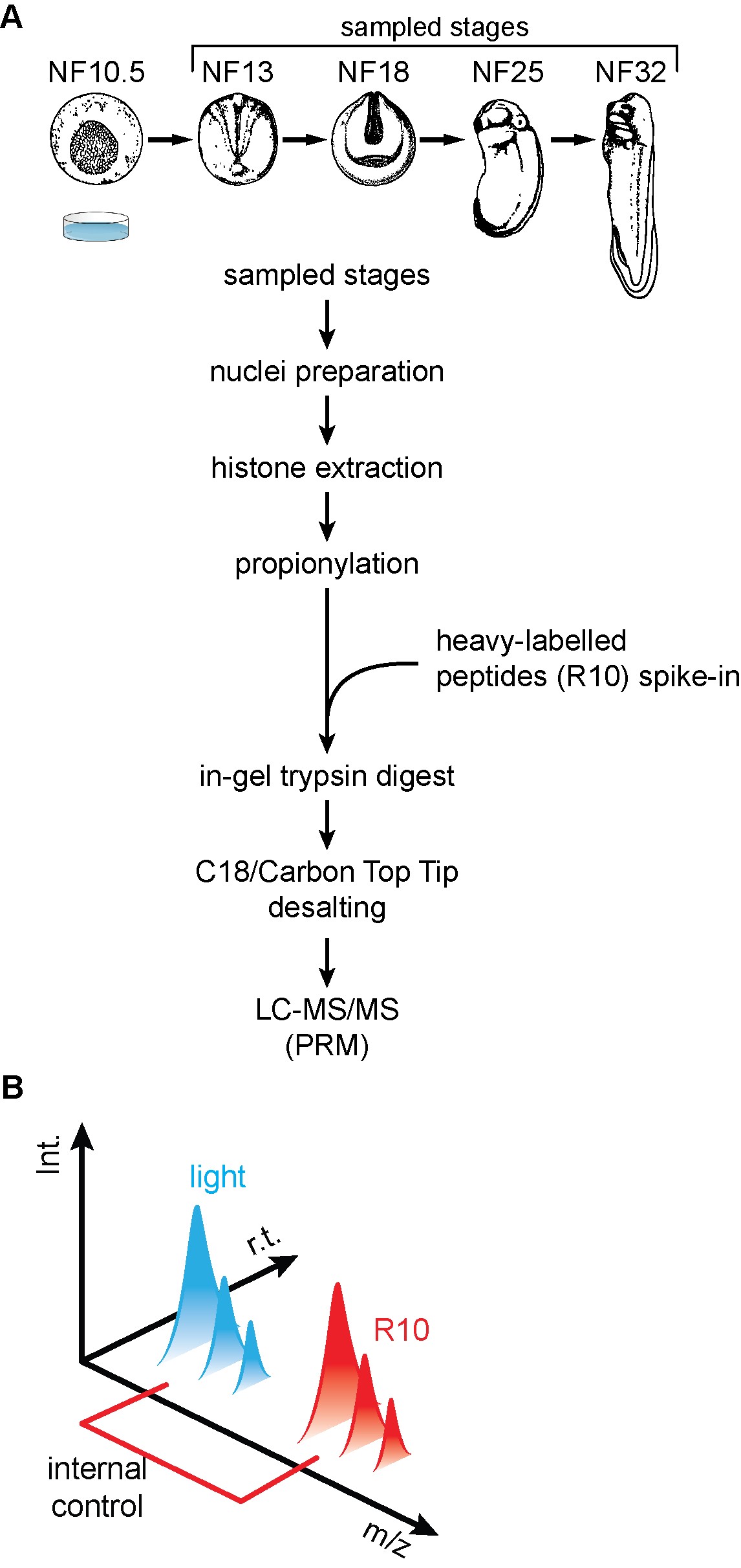 S7 Fig. Absolute quantification of histone posttranslational modification states by LCâMS/MS using scheduled PRM method. (A) Pipeline of mass spectrometry analysis of histone modifications from Xenopus laevis. Bulk histones are isolated from purified nuclei of embryos from 4 sampled stages (see Fig 1) by acidic extraction and SDS-PAGE. Propionylation blocks all endogenously unmodified and monomethylated lysine residues from being cleaved in the subsequent trypsin digest, thereby creating an optimized peptide pool for Mass Spec analysis. Due to this step, naturally unmodified lysine residues are labeled as âp,â tryptic peptides which have no modification states indicated as âun.â After propionylation, but before trypsin digest, we add to each sample a so-called R10 library (S2 Table), which consists of isotopically heavy-labeled arginine peptides (R10). The individual R10 peptides are mixed in equimolar concentration and mimic 64 histone H3 and H4 modification states. These isotopically heavy-labeled peptides serve as an internal and intersample control, allowing to minimize technical variations and to quantitate abundance of histone modification states on the absolute scale. (B) Representation of the R10 spike-in peptide control. Each of the analyzed endogenous histone modification states has a synthetized R10 peptide analog. Due to the same chemical properties, endogenous tryptic peptides and their R10 spiketide analogs elute at the same RT; however, they can be distinguished based on the mass to charge (m/z) ratio. Additionally, R10 spiketides help with peak identification based on RT and detail fragmentation spectra for isobaric peptides. LCâMS/MS, liquid chromatographyâtandem mass spectrometry; PRM, parallel reaction monitoring; RT, retention time. https://doi.org/10.1371/journal.pbio.3001377.s007 |