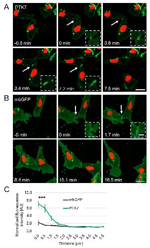 Figure 1 PTK7-GFP accumulates at cellâcell contact sites; Xenopus embryos were injected with 250 pg PTK7-GFP or 50 pg mbGFP RNA in combination with 250 pg H2B-mcherry RNA into one blastomere at the two-cell stage. NC cells were explanted at stage 17 and analyzed by spinning disk microscopy. (A) Time lapse images of PTK7-GFP expressing NC cells before (â0.8 min), during (0â7.2 min), and after (7.5 min) cell collision. The dashed square shows a higher magnification of the NC cellâcell contact zone. PTK7-GFP is highly enriched at the contact zone between NC cells, but immediately disappears when the cellâcell contacts are broken. NC cellâcell contacts are indicated by white arrows and are shown at higher magnifications in the boxed areas. Scale bar = 20 µm or 5 µm for higher magnification. (B) Time lapse images of mbGFP expressing NC cells before (â5 min), during (0â15.1 min) and after (18.5 min) collision. Like PTK7-GFP, mbGFP is localized at the membrane, however, it does not accumulate at cellâcell contact sites of colliding NC cells. (C) The graph shows the fluorescence intensity at the cellâcell contact site normalized to the membrane fluorescence at a non-contact site at 0 to 5 µm distance from the membrane. Average values and standard errors of the mean (SEM) are shown for 18 PTK7-GFP and 22 mbGFP expressing NC cells of at least three independent experiments, *** p < 0.005 (two-way ANOVA). |