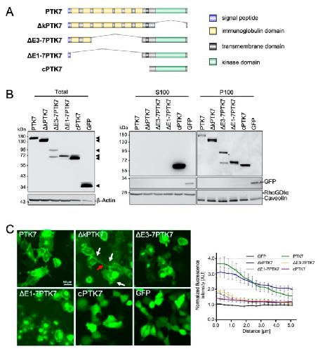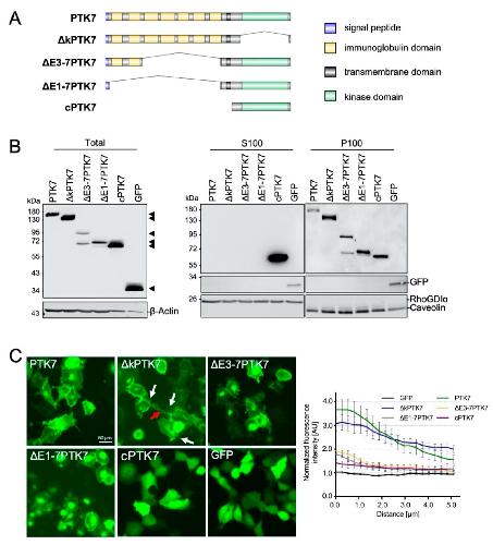 Figure 2. Localization of distinct Ptk7 deletion constructs in H1299 cells. (A) Schematic presentation of the Ptk7 domain structure and its different deletion mutants. (B) Transient expression of Ptk7-GFP variants in H1299 cells 24 h after transfection. Total cell lysates (left panel) were prepared by homogenizing the cells in RIPA-buffer and 50 µg of cell lysates were subjected to SDS-PAGE and immunoblotting. Due to the high expression level, 10 µg of lysate from cPTK7- and 5 µg from GFP-expressing cells were loaded. For subcellular localization (right panels) lysates were separated by 100,000× g centrifugation in soluble (S100) and particulate (P100) fractions. Aliquots of each fraction were analyzed by immunoblotting. GFP-containing proteins were detected by GFP-HRP antibody and ECL. Detection of β-Actin served as loading control, RhoGDIα as a marker for the cytosolic (S100) and Caveolin for the particulate (P100) fraction. (C) Fluorescence analysis of living Ptk7-GFP-expressing H1299 cells 24 h after transfection showing the subcellular localization of the transiently expressed GFP fusion proteins. Red arrows show tube-like structures, white arrows show membrane-spikes. Bar: 50 µm. The graph shows the fluorescence intensity at the cell–cell contact site normalized to the membrane fluorescence at a non-contact site at 0 to 5 µm distance from the membrane (mean ± SEM, n = 8−10). |