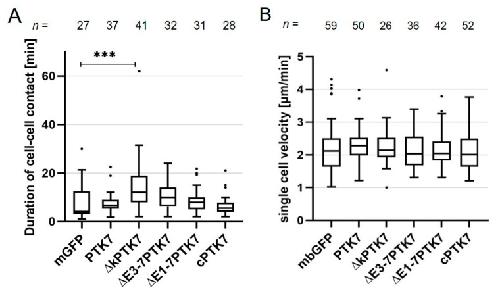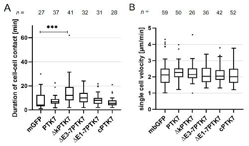 Figure 4 âkPTK7 overexpressing NC cells stay longer in cellâcell contact compared to controls, while single cell velocity is not affected. (A) Box plot showing cellâcell contact time (in minutes) during collision of NC cells expressing various Ptk7 constructs. NC cells expressing ÎkPTK7-GFP exhibit a significantly increased contact time compared to the control. (B) Graph blotting single cell velocity of NC cells expressing the indicated Ptk7 constructs. Box and whiskers plots summarize results of at least three independent experiments, the number of analyzed cells for each condition is indicated at the top. The box extends from the 25th to the 75th percentile, with whiskers with maximum 1.5 IQR. The median is plotted as a line inside the box. *** p < 0.005 (KruskalâWallis test). |