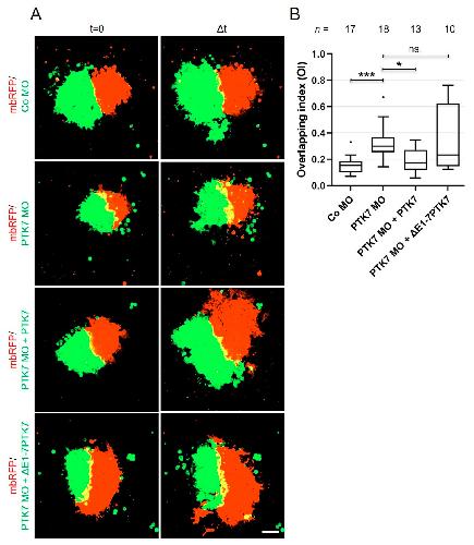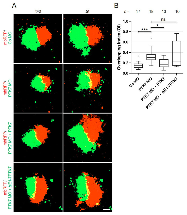 Figure 6. Loss of Ptk7 inhibits CIL in cranial NC explants. Confrontation assays were performed using explants injected with either 6.5 ng MO in combination with 100 pg mbGFP RNA or 200 pg mbRFP RNA as control. For rescue experiments 200 pg PTK7 or ∆E1-7PTK7 RNA were co-injected with the MO. (A) First column: confronted explants at the start of the experiment (time point t = 0). Second column: confronted explants at the time point of the maximal invasion (Δt). Injected constructs are indicated for each condition on the left. The overlapping area is marked by yellow fluorescence. (B) Box plot showing overlapping indexes (OI) of the different NC explants with the control. The total number of analyzed confrontation events of at least three independent experiments is indicated for each column. The box extends from the 25th to the 75th percentile, with whiskers with maximum 1.5 IQR. The median is plotted as a line inside the box. * p < 0.05, *** p < 0.005, ns.: not significant (Kruskal–Wallis test). |