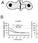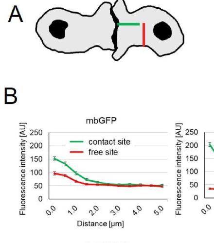 Supplementary Figure S1. Average fluorescence intensity at the cell-cell contact site normalized to control sites for NC cells expressing various Ptk7 deletion constructs or mbGFP. (A) Schematic representation showing two cells at the moment of maximal cell-cell contact. The green bar marks the area (5 μm) along which the fluorescence intensity at the cell-cell contact site was determined. The red bar marks the measured fluorescence intensity at a control membrane (no cell-cell contacts or protrusions). (B) The graph shows the fluorescence intensity at the cell-cell contact site (green) as well as the membrane fluorescence at a non-contact site (red) at 0 to 5μ m distance from the membrane of NC cells expressing either mbGFP, PTK7-GFP, ÎkPTK7-GFP, ÎE3-7PTK7-GFP, ÎE1-7PTK7-GFP or cPTK7-GFP. |