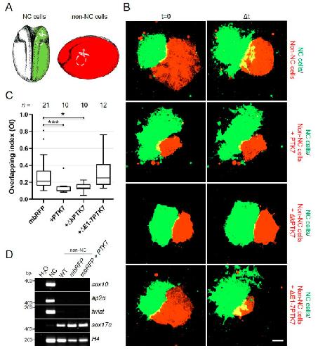 Figure 7 The extracellular domain of Ptk7 protects non-NC tissue from NC cell invasion. (AâC) Embryos were injected with either 100 pg mbGFP RNA or 200 pg mbRFP RNA, alone or in combination with 500 pg PTK7, ÎkPTK7, or ÎE1-7PTK7 RNA, in one blastomere at the two-cell stage. (A) At early neurula stage, either green fluorescent NC cells or red fluorescent non-NC cells were dissected. NC cells were co-cultured with non-NC cells and analyzed by time lapse microscopy. (B) First column: confronted explants at the start of the experiment (time point t = 0). Second column: confronted explants at the time point of maximal invasion (Ît). Green fluorescent NC cells invaded red fluorescent control non-NC tissue (upper lane). Overexpression of PTK7 and ÎkPTK7 in non-NC explants prevented NC cell invasion (middle lanes). Non-NC tissue expressing ÎE1-7PTK7 was invaded by NC cells (bottom panel) as it was observed in the control. Scale bar = 100 µm. (C) Box plot showing overlapping indexes (OI) of NC explants confronted with non-NC tissue expressing mbRFP alone or in combination with various Ptk7 deletion constructs. Overexpression of PTK7 and ÎkPTK7, but not ÎE1-7PTK7, significantly decreased the OI. Number of analyzed confrontation events of at least three independent experiments is indicated for each column. The box extends from the 25th to the 75th percentile, with whiskers with maximum 1.5 IQR. The median is plotted as a line inside the box. * p < 0.05, *** p < 0.005 (KruskalâWallis test). (D) Marker expression of the explanted tissue was determined by performing RT-PCR utilizing the NC marker sox10, ap2α, and twist as well as the endoderm marker sox17α. Amplification of histone H4 (H4) was used as an internal control. |