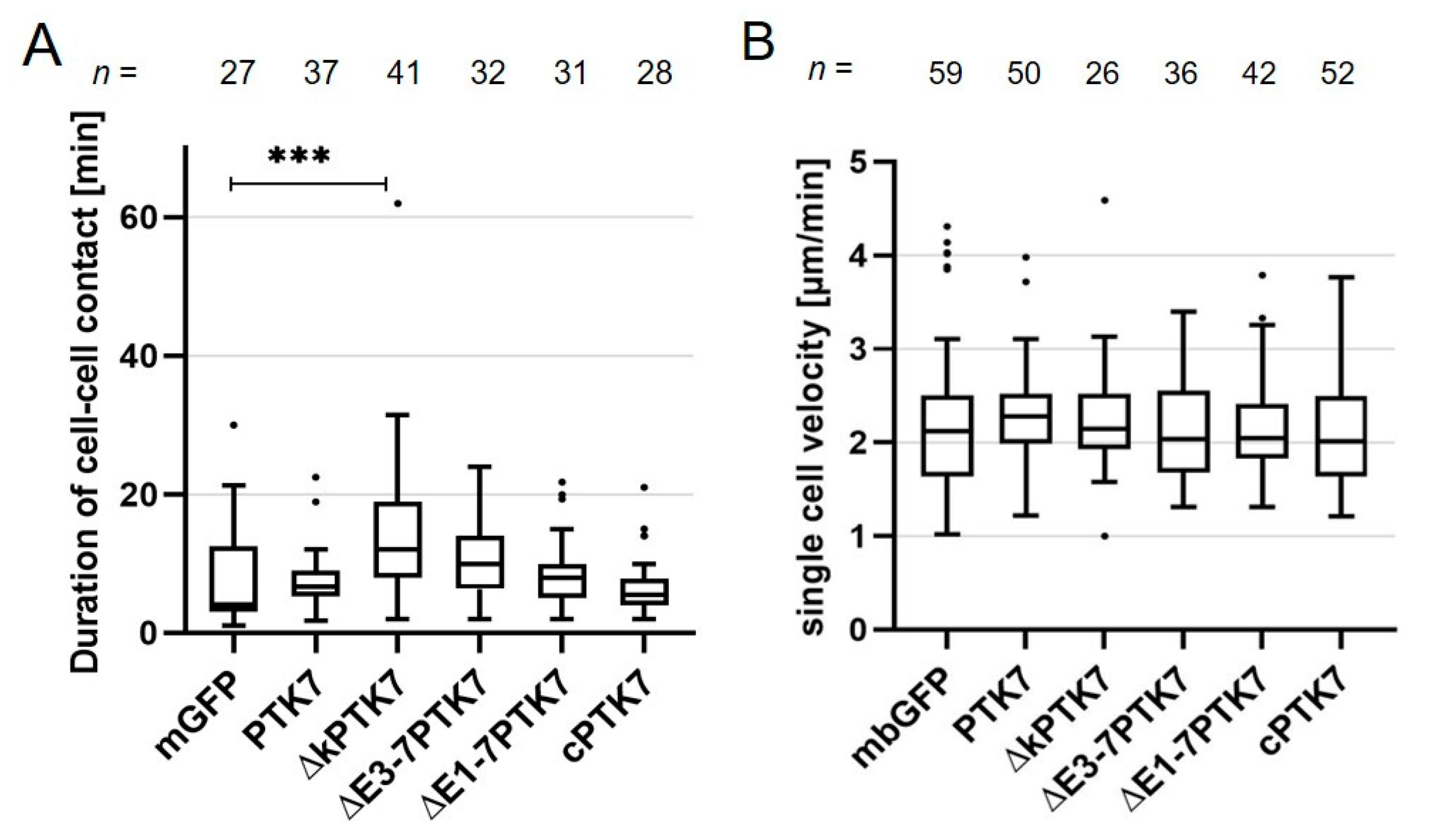 Figure 4. ∆kPTK7 overexpressing NC cells stay longer in cell–cell contact compared to controls, while single cell velocity is not affected. (A) Box plot showing cell–cell contact time (in minutes) during collision of NC cells expressing various Ptk7 constructs. NC cells expressing ΔkPTK7-GFP exhibit a significantly increased contact time compared to the control. (B) Graph blotting single cell velocity of NC cells expressing the indicated Ptk7 constructs. Box and whiskers plots summarize results of at least three independent experiments, the number of analyzed cells for each condition is indicated at the top. The box extends from the 25th to the 75th percentile, with whiskers with maximum 1.5 IQR. The median is plotted as a line inside the box. *** p < 0.005 (Kruskal–Wallis test). |