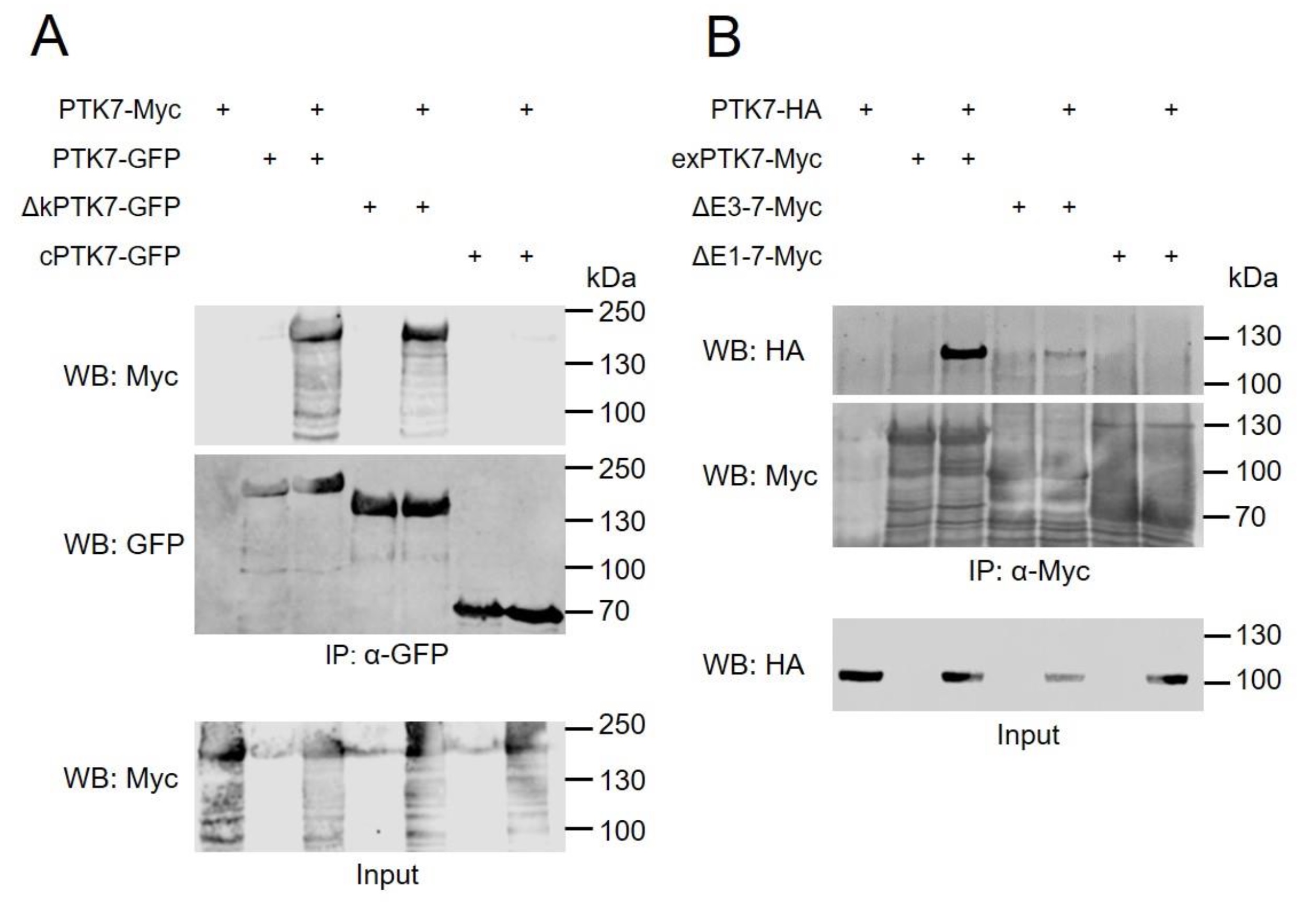 Figure 5. Ptk7 mediates homophilic binding via its extracellular domains. (A) Schematic overview of the respective constructs. Their ability to bind to full-length Ptk7 is indicated by (+), the lack of binding by (−). HEK293 cells were transfected as indicated and immunoprecipitations were performed using anti-Myc (B) or anti-HA antibodies (C). Cell lysates are shown in the bottom panel, co-immunoprecipitated proteins in the upper panel and immunoprecipitated proteins in the middle panel. Antibodies used for Western blotting (WB) are indicated on the left, molecular weights (kDa) are indicated on the right. Representative results of at least three independent experiments are shown. The quantity of PTK7 and ∆kPTK7 co-precipitated with full-length PTK7 in respect to the respective inputs was determined by densitometric analysis (LI-COR Image Studio): mean value PTK7: 1 for ∆kPTK7: 2.6. |
