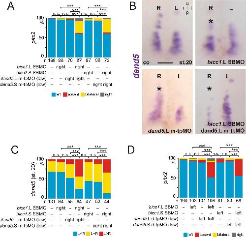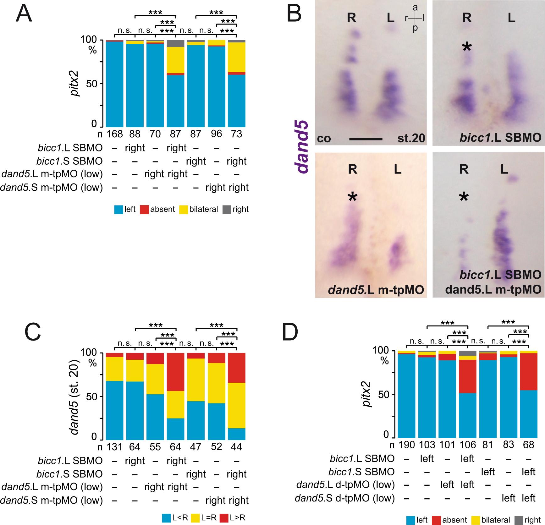 Fig. 5: Bicc1 regulates dand5 mRNA through distinct regions of the Bicc1RE. A Quantification of right-sided pitx2 induction by co-injecting a low, ineffective m-tpMO dosage with single allele-specific bicc1 SBMO. Controls (co), m-tpMO (S or L, low), or allele (S or L) specific bicc1 SBMO alone showed wt pitx2 asymmetry. B Co-injecting m-tpMO (low) with bicc1 TPMO (L or S) impacted dand5 mRNA stability. Treatment with low concentrations of m-tpMO, single allele-specific bicc1 TPMO, and uninjected co showed wt dand5 expression at post-flow stages. C Quantification of dand5 expression. D Quantification of pitx2 asymmetry. Only in combination both suboptimal dosages of d-tpMO (low) or single allele-specific bicc1 SBMO (S or L) prevented left pitx2 expression. Wt expression was found in controls (co) and in embryos that were left-sided injected with one MO alone. MO pmol/embryo: bicc1 SBMO (L or S, 1); m-tpMO low (L or S, 0.4); d-tpMO low (L or S, 0.5). Asterisks in B mark injected side. Numbers (n) in A, C, and D represent analyzed specimens from more than independent experiments. Statistical analyses were done with one-sided Pearsonâs chi-square test, which was adjusted for multiple comparisons by Bonferroni (A, D) or BonferroniâHolm (C). n.s., not significant pâ>â0.05; ***, very highly significant pâ<â0.001. p values and listing of individual experiments can be found in the source data file. Scale bar in B represents 100âµm. st. stage, a anterior, l left, r right, p posterior. |