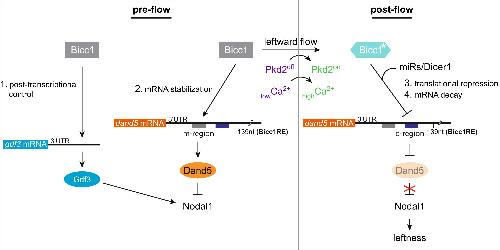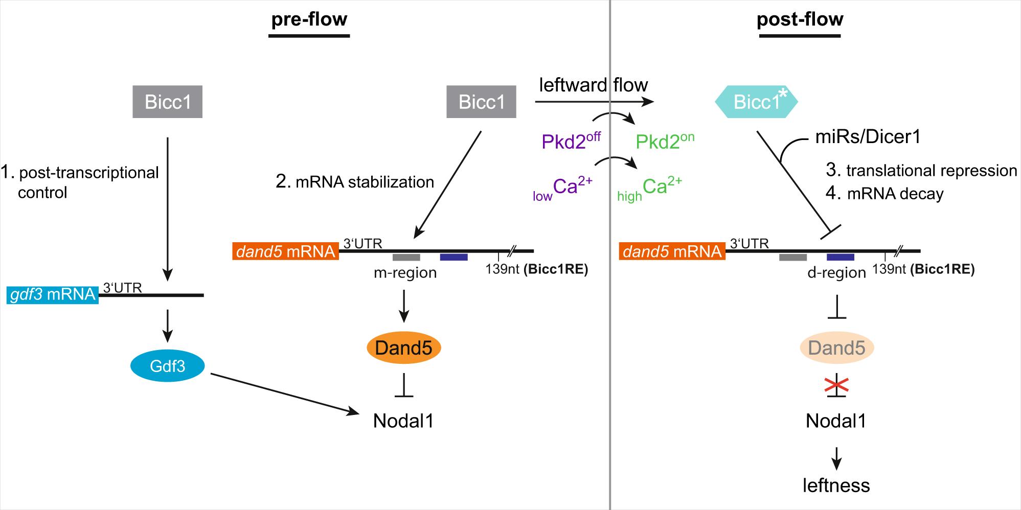 Rotating cilia at the vertebrate left-right organizer (LRO) generate an asymmetric leftward flow, which is sensed by cells at the left LRO margin. Ciliary activity of the calcium channel Pkd2 is crucial for flow sensing. How this flow signal is further processed and relayed to the laterality-determining Nodal cascade in the left lateral plate mesoderm (LPM) is largely unknown. We previously showed that flow down-regulates mRNA expression of the Nodal inhibitor Dand5 in left sensory cells. De-repression of the co-expressed Nodal, complexed with the TGFß growth factor Gdf3, drives LPM Nodal cascade induction. Here, we show that post-transcriptional repression of dand5 is a central process in symmetry breaking of Xenopus, zebrafish and mouse. The RNA binding protein Bicc1 was identified as a post-transcriptional regulator of dand5 and gdf3 via their 3'-UTRs. Two distinct Bicc1 functions on dand5 mRNA were observed at pre- and post-flow stages, affecting mRNA stability or flow induced translational inhibition, respectively. To repress dand5, Bicc1 co-operates with Dicer1, placing both proteins in the process of flow sensing. Intriguingly, Bicc1 mediated translational repression of a dand5 3'-UTR mRNA reporter was responsive to pkd2, suggesting that a flow induced Pkd2 signal triggers Bicc1 mediated dand5 inhibition during symmetry breakage.