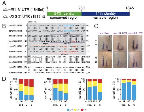 Supplementary Figure 1. Characterization of dand5 3'-UTRs (A) Conservation of 3'-UTR sequences between S- and L-alloalles of X. laevis. (B) Sequence alignment of the proximal 228 respective 229 nucleotides of dand5 3'-UTRs of S- and L-alloalleles. Minimal Bicc1 responsive element (Bicc1RE) is indicated by a grey background. The positions of the m-tpMOs and d-tpMOs are marked by blue and red lines, respectively. Two to three (S-UTR) potential Bicc1 binding motifs (based on 1) are highlighted in red. Putative miR133 interaction site is indicated by blue letters. (C) Representative dorsal explants of stage 18 (top row) and stage 20 (bottom row) embryos hybridized with antisense RNA probes specific for the dand5 coding sequence (left), or the 3'-UTRs of dand5 S- (middle) and L-allele (right). (D) Quantification of results of a time course analysis from stage 17-20. Following in situ hybridization and visual judgement, scoring was carried out according to 2 i.e. bilateral symmetric (L=R), left stronger than right (L>R) or vice versa (L<R). n in the x-axis represent number of embryos analyzed. Scale bar in (C) represents 100 μm. st., stage; a, anterior; l, left; r, right; p, posterior. Listing of individual experiments can be found in the source data file. |