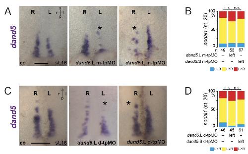 Supplementary Figure 2. dand5 and nodal1 expression in tpMO injected embryos. (A) dand5 expression in pre-flow stage 16 of controls, left- or right-sided m-tpMO injections. Note that irrespective of which half was targeted, dand5 mRNA was reduced. (B) Quantification of nodal1 expression at stage 20 of wt controls and left-sided m-tpMO injected embryos. No effect on nodal1 mRNA by m-tpMO treatment. (C) Wt dand5 expression following injections of d-tpMO in pre-flow specimens (st. 16). (D) Quantification of nodal1 mRNA signals. Note no difference at stage 20 between wt controls and left-sided d-tpMO injections. MO pmol/embryo: m-tpMO (L or S, 0.8); d-tpMO (L or S, 1). Asterisks in (A and C) mark injected side. Numbers (n) represent analyzed specimens from >3 independent experiments. st., stage; a, anterior; l, left; r, right; p, posterior; n.s., not significant. Scale bars in (A and C) represents 100 μm. p-values and listing of individual experiments can be found in the source data file. Statistical analyses were done with a one-sided Pearsonâs chi-square test (Boniferroni-Holm corrected). |