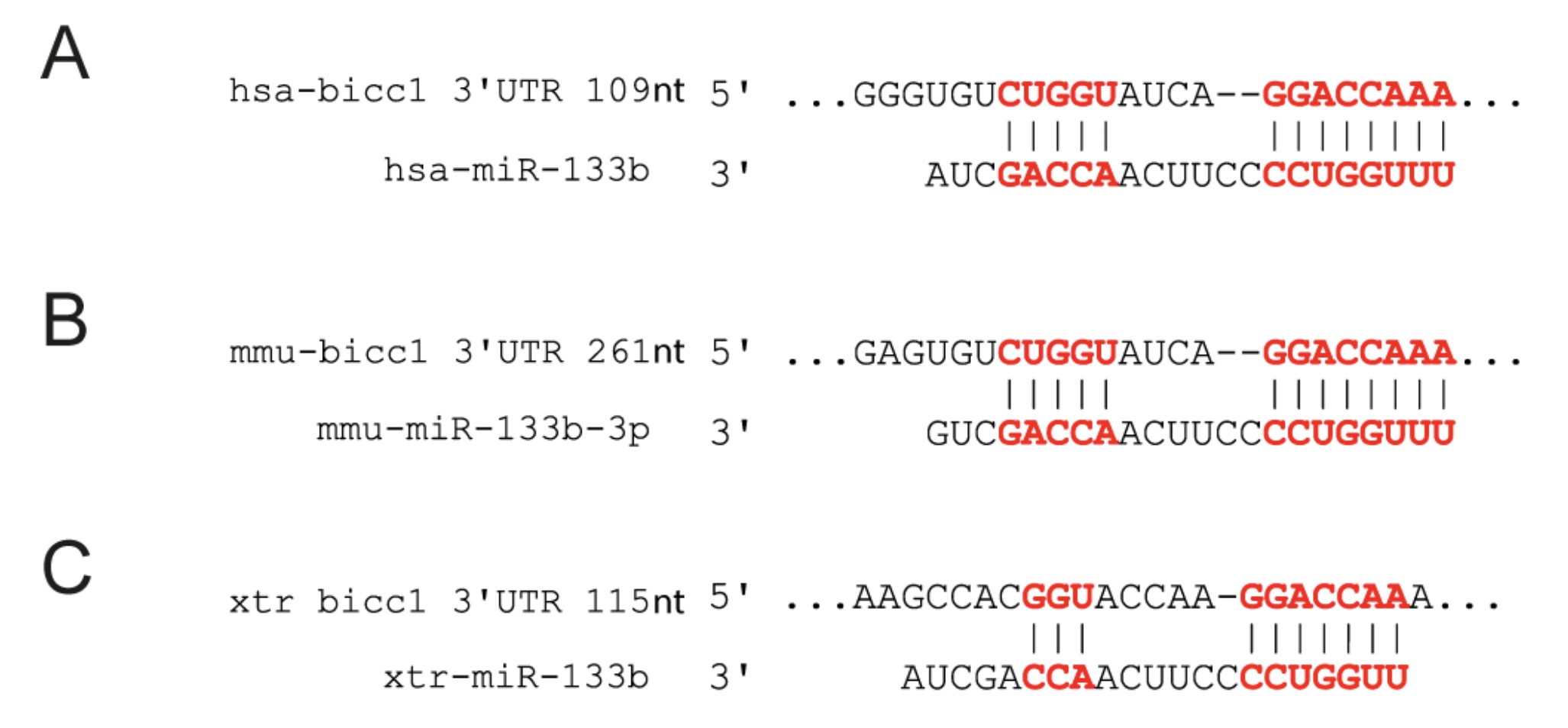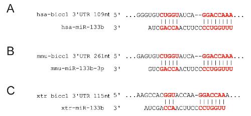 Supplementary Figure 7. Conserved miR-133 binding sites in the bicc1 3'UTR. Targetscan analysis 5,6 predicts miR133 hybridization to the human (A; hsa), mouse (B; mmu) and Xenopus tropicalis (C; xtr) bicc1 3'UTR. Nucleotide (nt) position of 3'UTR where the seed sequence starts is indicated. |