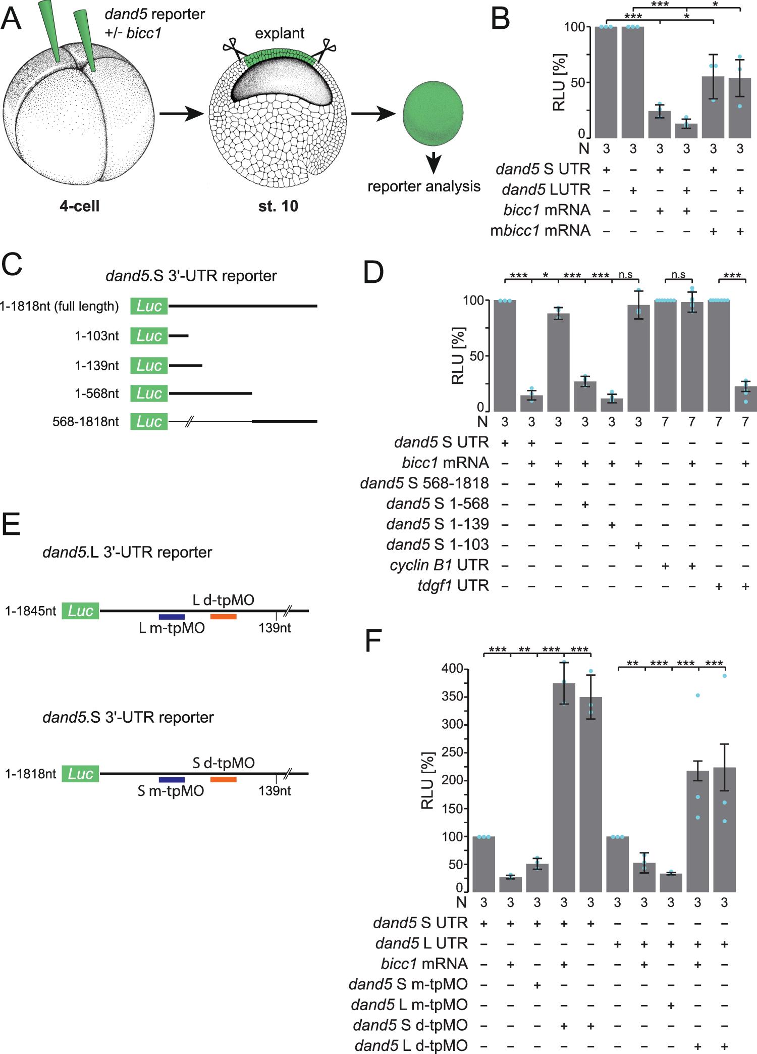 Fig. 1: Bicc1 represses dand5 mRNA translation via its proximal 3â²-UTR. A Schematic depiction of dand5 reporter assay. dand5 3â²-UTR sequences fused to luciferase coding were injected either with or without bicc1 mRNA into the animal region of four-cell embryos. At st. 10, the animal cap region was excised and assayed for luciferase activity. Adapted from refs. 65 and 66. B Animal cap reporter assay following injections of dand5 S- or L 3â²-UTRs alone or together with Xenopus (bicc1) or mouse Bicc1 (mbicc1) effector mRNAs. Note that both alloalleles were equally repressed. Note also that mbicc1 was efficient as a repressor as well. C Luciferase reporter constructs harboring different regions of the dand5 (S-allele) 3â²-UTR. D Repression of translation is mediated through a proximal 139 nucleotides (nt) sequence element in the dand5 3â²-UTR. E Schematic depiction of medial and distal target protector MOs (m-tpMOs or d-tpMOs) binding to the minimal Bicc1 responsive element (Bicc1RE) in the dand5 3â²-UTR (L or S). F m- and d-tpMOs (0.4 or 0.5 pmol/embryo, respectively) interact differently with the luciferase reporter expression. m-tpMO blocked and d-tpMO boosted luciferase activity. Co-injection of d-tpMOs prevented Bicc1-dependent repression of the full-length dand5 reporters (L and S) and further enhanced their expressivity. N in B, D, and F represents the number of independent experiments. A pool of 10 animal caps was analyzed per experiment and treatment. Results from reporter mRNAs alone served as reference and were set to 100% RLU. Relative values of single experiments are depicted as blue dots. Data of at least three experiments are presented as mean value (bar) ±standard deviation (error bar, SD). Statistical analyses were done with a one-sided Studentâs t test for two independent means (Bonferroni corrected) using the values of at least three individual experiments. p values, values for individual experiments, the mean values, and standard deviations are found in the source data file. n.s. not significant pâ>â0.05; * significant, pâ<â0.05; ** highly significant pâ<â0.01; ***, very highly significant pâ<â0.001; RLU relative luciferase units; Luc luciferase. |