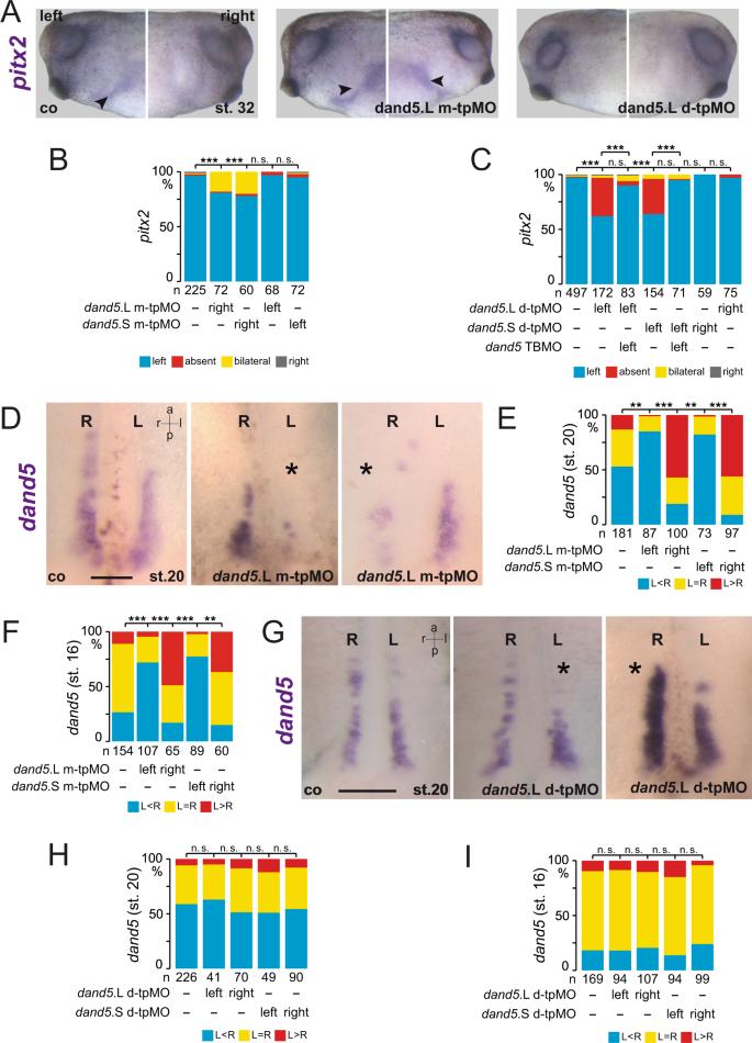 Fig. 2: Bicc1 responsive element (Bicc1RE) of the dand5 3â²-UTR is required for LR asymmetry. A Uninjected control (co), m-tpMO, or d-tpMO-injected embryos showed left, bilateral, or absent pitx2 expression, respectively. Lateral views (left and right) of embryos are presented. Arrowheads mark pitx2-positive lateral plate mesoderm. B Quantification of pitx2 results of m-tpMO-treated specimens. C Quantification of pitx2 asymmetry by d-tpMO injections. Note administration of dand5 TPMO together with d-tpMOs restored wt pitx2 expression. D Diminished dand5 mRNA expression by left-sided and right-sided m-tpMO injections compared with control. E Quantification of dand5 expression at post-flow stages (st.20) following m-tpMO treatment. F Quantification of dand5 expression in pre-flow specimens injected with m-tpMO. G Wildtype dand5 repression in control (co) and left- or right-sided d-tpMO injected specimens. H Quantification of dand5 asymmetry. Note flow-induced dand5 mRNA decay was observed in controls and following d-tpMO application. I Quantification of dand5 staining of pre-flow specimens (st.16) following d-tpMO injections. MO pmol/embryo: m-tpMO (L or S, 0.8); d-tpMO (L or S, 1). Asterisks in D and G mark injected side. Scale bars in D and G represent 100âµm. Numbers (n) in B, C, E, F, H, and I represent analyzed specimens from more than three independent experiments. Statistical analyses were done with one-sided Pearsonâs chi-square test, which was adjusted for multiple comparisons by Bonferroni (B, C) or BonferroniâHolm (E, F, H, I). p values and listing of individual experiments can be found in the source data file. n.s. not significant pâ>â0.05; **highly significant pâ<â0.01; ***very highly significant pâ<â0.001; st. stage; a anterior; l left; r right; p posterior. |