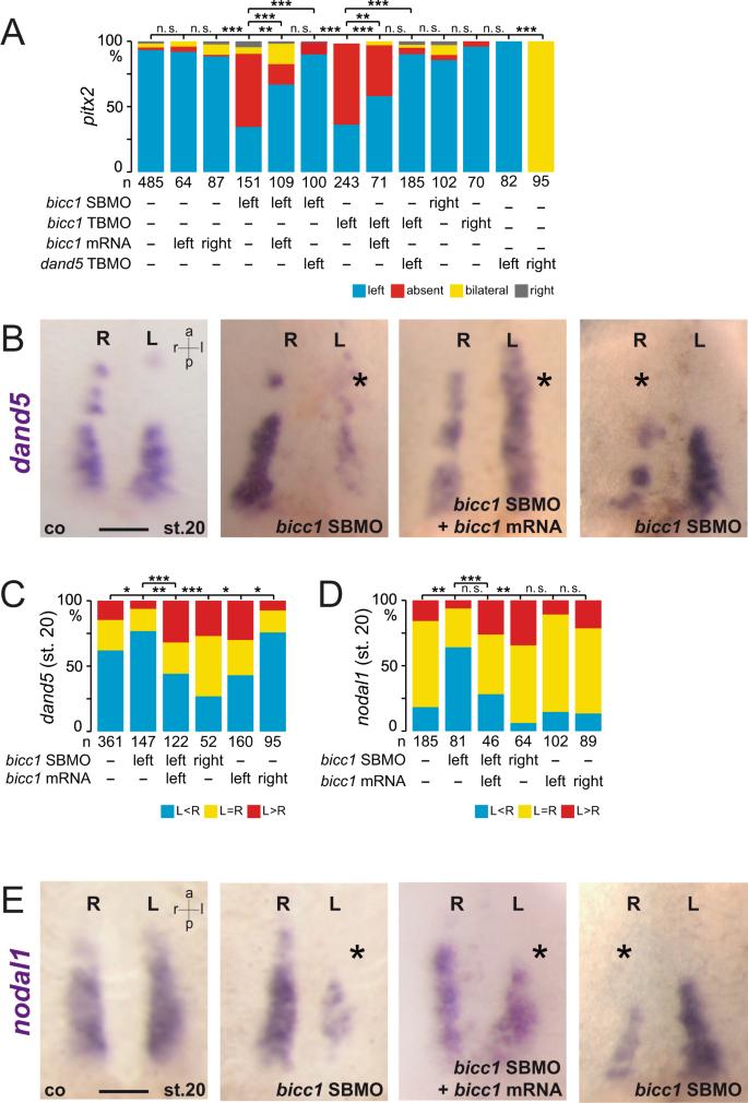 Fig. 3: Bicc1-dependent dand5 and nodal1 expression in sLRO cells. A Absence of left LPM pitx2 expression in bicc1 morphants, unilaterally injected on the left, was rescued by parallel knockdown of dand5. Specificity of TBMO or SBMO was shown by co-injecting rescue mRNAs, i.e., mouse bicc1 or Xenopus bicc1, respectively. Note dand5 knockdown on the right efficiently induced pitx2 expression, as published. B Loss of dand5 mRNA at post-flow stages (st. 20) following left- and right-sided bicc1 SBMO injections. Controls (co) showed wt expression. dand5 expression was restored by co-injecting bicc1 rescue mRNA. Note enhanced dand5 staining in rescued specimens. C Quantification of dand5 expression after knockdown of bicc1. The effect was observed in the left and right sLRO cells. D, E Downregulation of nodal1 in bicc1 morphants. D Quantification of results. E Wt specimens show bilateral nodal1 mRNA. Left or right bicc1 SBMO injections reduced nodal1, which was restored by adding rescue bicc1 mRNA. MO pmol/embryo: bicc1 SBMO (L and S, each 1); bicc1 TBMO, (L and S, each 1); dand5 TPMO (0.5). Asterisks in B and E mark the injected side. Numbers (n) in A, C, and D represent analyzed specimens from more than three independent experiments. Statistical analyses were done with one-sided Pearsonâs chi-square test, which was adjusted for multiple comparisons by Bonferroni (B) or BonferroniâHolm (C, D). n.s. not significant pâ>â0.05; * significant, pâ<â0.05; ** highly significant pâ<â0.01; ***, very highly significant pâ<â0.001. p values and listing of individual experiments can be found in the source data file. st., stage. Scale bars in B and E represent 100âµm. st. stage, a anterior, l left, r right, p posterior. |