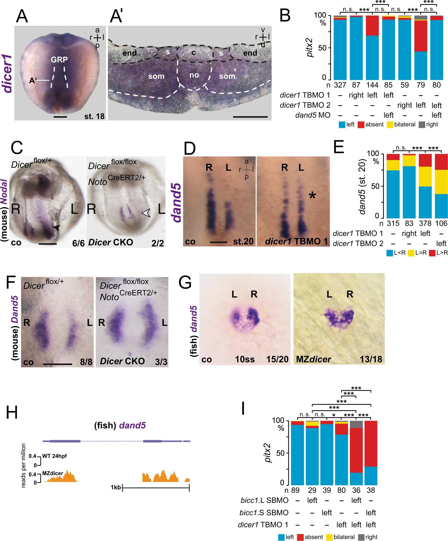 Fig. 6: Dicer interacts with Bicc1 in dand5 repression. A Expression of dicer1 in sensory (s) LRO cells (âNâ=â3; n =â30) of the frog (GRP; gastrocoel roof plate). Whole-mount in situ hybridizations of stage 18 dorsal explant with a dicer1-specific antisense RNA probe. (Aâ) The transverse histological section (indicated in A) reveals mRNA expression in sLRO cells, somites (som), and deep cells of the notochord (no), but absence of signals from central (c) flow-generating LRO and lateral endodermal cells (end). B Quantification of MO-mediated inhibition of dicer. Note knockdown in left, but not right sLRO cells prevented pitx2 asymmetry in the left LPM, which was rescued by co-injecting dand5 MO. C mRNA expression of nodal in control (Dicerflox/+) and dicer conditional knockout (Dicerflox/flox NotoCreERT2/+) mouse embryos at E8.0. Note that Nodal asymmetry in the left LPM (arrowhead) was lost in mutants. D Absence of flow-induced dand5 mRNA decay at the left LRO margin in post-flow dicer1 morphants (st. 20). Representative dorsal explants of wt (left) and dicer1 morphant (right) specimens hybridized with a dand5 antisense RNA probe. E Quantification of dand5 results. F Flow-induced Dand5 mRNA downregulation in left crown cells of the murine node was lost in Dicer conditional knockout (Dicerflox/flox NotoCreERT2/+) mouse embryos at E7.5. G Lack of dand5 repression in 10 somite stage (ss) MZdicer mutant zebrafish embryos. H Absence of dand5 mRNA by RNAseq reads in 24hpf wt zebrafish embryos, but maintenance in MZdicer mutants. I bicc1 and dicer1 interact in LR asymmetry. Wt pitx2 expression upon isolated left-sided injections of allele-specific bicc1 SBMOs and moderate effects upon dicer1 TBMO1 injection. Asymmetric pitx2 was significantly inhibited by co-injecting dicer1 and bicc1 MOs. MO pmol/embryo: dicer1 TBMO1 (1.5); dicer1 TBMO2 (1); bicc1 TBMO (L or S, each 1); bicc1 SBMO (L or S, each 1). Asterisks in D mark injected side. Numbers (n) in B, E, and I represent analyzed specimens from three independent experiments. Statistical analyses were done with one-sided Pearsonâs chi-square test, which was adjusted for multiple comparisons by Bonferroni (B, I) or BonferroniâHolm (E). n.s. not significant pâ>â0.05; * significant, pâ<â0.05; ***, very highly significant pâ<â0.001. p values and listing of individual experiments can be found in the source data file. Scale bars in A, Aâ, C, F, and D represent 100âµm. st. stage, a anterior, d dorsal, l left, r right, v ventral, p posterior. |