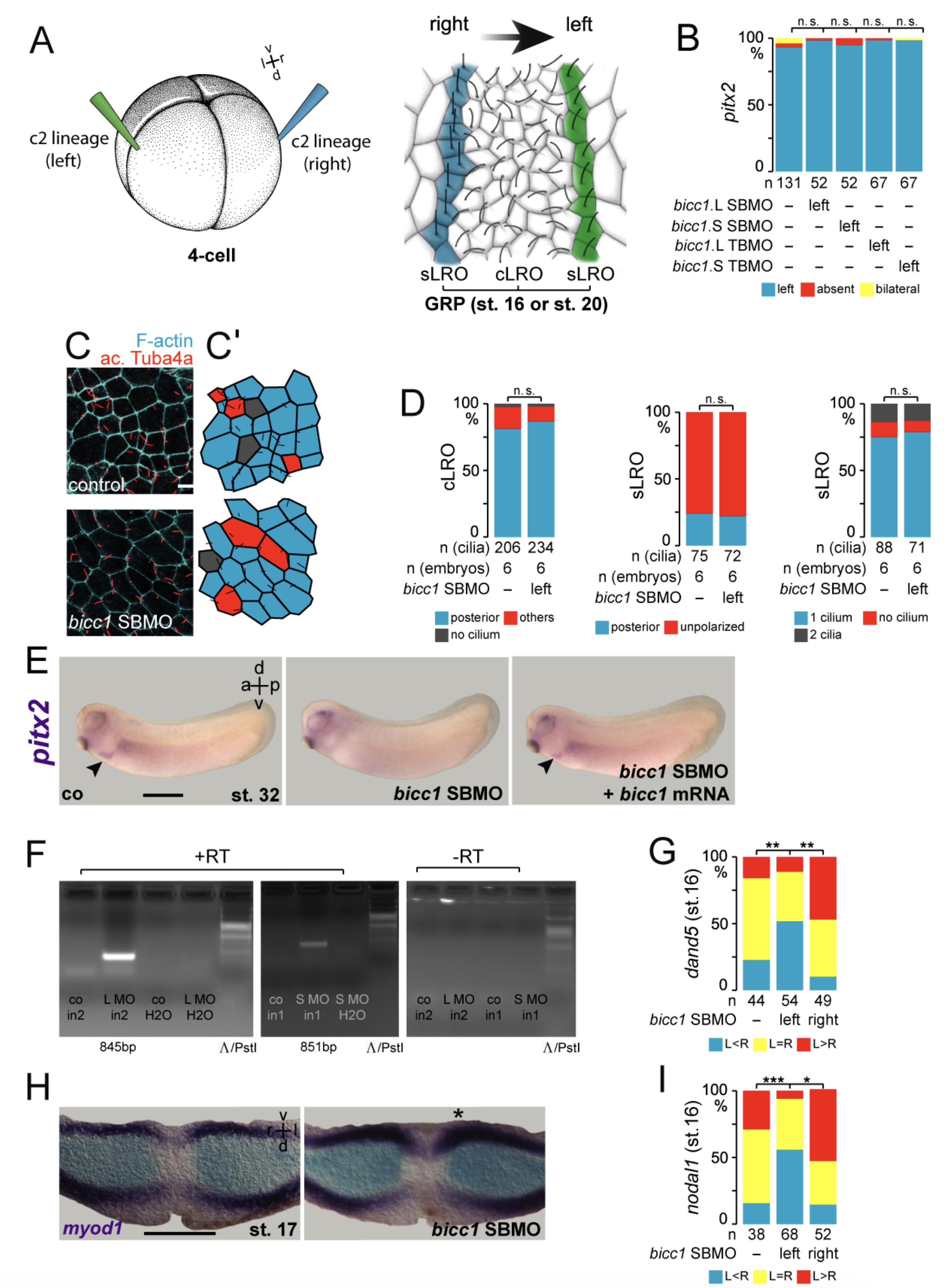 Supplementary Figure 3. Characterization of bicc1 morphants (A) Schematic depiction of injection scheme at the 4-cell stage to target specifically left (green) or right (blue) flow sensing cells at the gastrocoel roof plate (GRP; left-right organizer, LRO), which is shown as a dorsal explant of the archenteron at stage 19 Adapted from 3 and 4. (B) Quantification of allele specific bicc1 knockdowns. Note individual L or S MO (TB or SB; 1 pmol/embryo) has no effect on pitx2 asymmetry. (C) Unaltered LRO ciliation in bicc1 morphants. Representative dorsal explants of control and bicc1 morphant specimens are stained with anti- ac. tubulin (red) and phalloidin (F-actin, green). (C') Cartoon of the assessment of cilia polarization. (D) Quantification of ciliary parameters in bicc1 morphants (1 pmol). Note cilia polarization of flow generating cLRO and targeted flow sensing lateral sLRO cells was not affected by bicc1 LoF. Ciliation of sLRO cells was not altered either. (E) pitx2 expression in representative control (co), bicc1 morphant and specimen in which both SBMOs (L and S) and a full- length bicc1 mRNA not targeted by the MOs were co-injected. (F) RT-PCR on stage 18 embryos which were injected with bicc1 SBMOs (L or S) showing intron retention (intron2, in2) or intron1, in1), respectively. No PCR products were found in negative control samples where reverse transcriptase was omitted (-RT). (G, I) Quantification of dand5 and nodal1 expression in bicc1 morphants at pre-flow stage 16. Both dand5 and nodal1 mRNA were strongly reduced by bicc1 knockdown, irrespective of which side was targeted. (see Figure 2D,E). (H) Expression of myoD at stage 17 showed that fate and morphogenesis of lateral sLRO was not affected by bicc1 LoF. MO pmol/embryo: bicc1 SBMO (L and S, each 1); bicc1 SBMO (L or S, 1). Numbers (n) in (B, D, G and I) represent analyzed specimens from >3 independent experiments. st., stage; a, anterior; l, left; r, right; p, posterior; d, dorsal; v, ventral; n.s., not significant; ***, very highly significant, p < 0.001; **, highly significant, p < 0.01. Asterisk in (H) marks injected side. Scale bars represent in (E) 1mm, in (H) 100 μm and in (C) 10 μm. p-values and listing of individual experiments can be found in the source data file. Statistical analyses were done with two-sided student t-test for 2 independent means (D, Boniferroni corrected) or with a one-sided Pearsonâs chi-square test (B, G and I, Boniferroni-Holm corrected). |