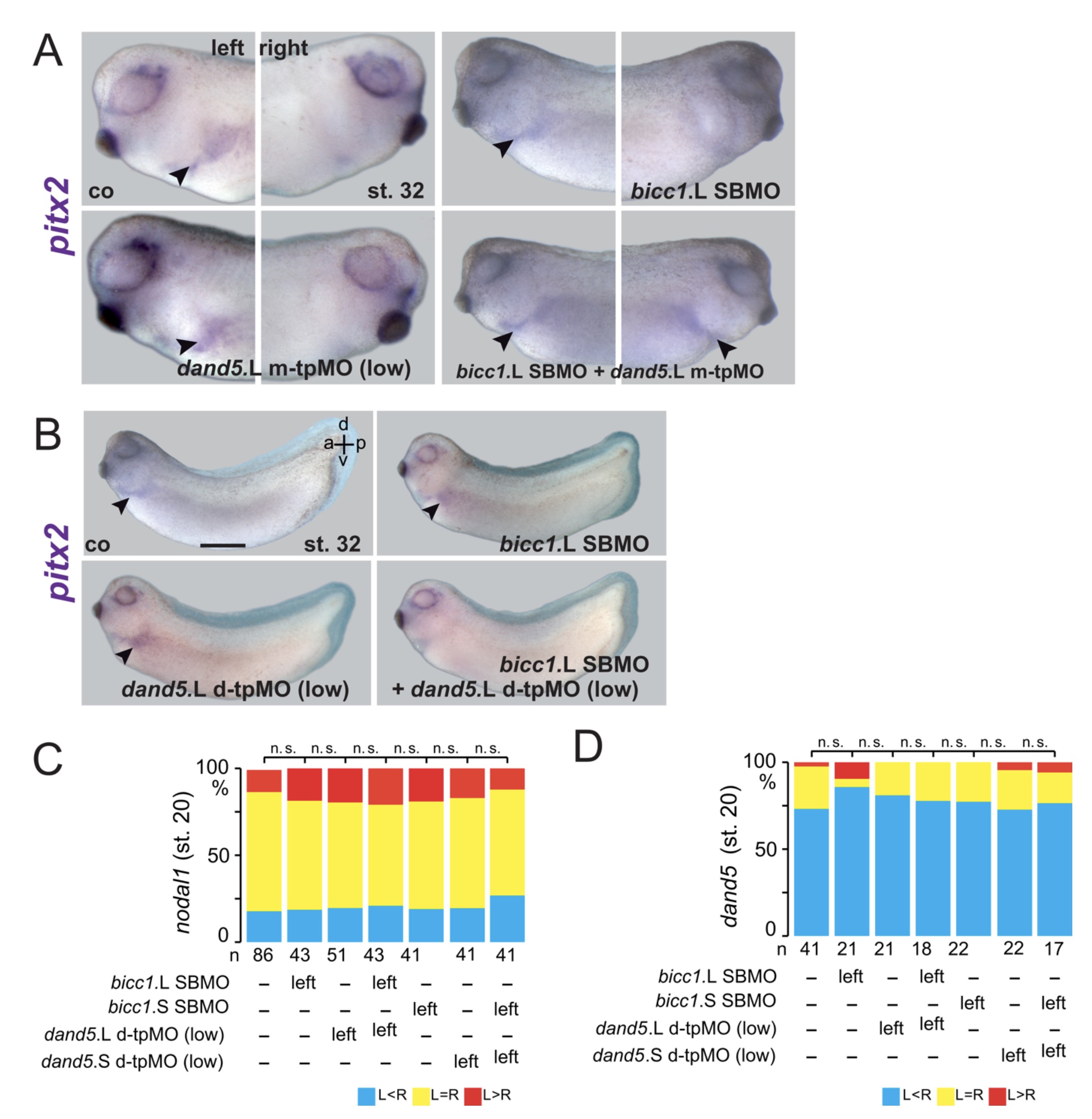 Supplementary Figure 5. pitx2 expression, but not nodal1 transcription is altered by a combined treatment with low dose tpMO and single allele specific bicc1 knockdown. (A) Controls (co) as well as right sided injections of single L allele specific bicc1 SBMO or low dose of m-tpMO have no effect. Combining both MOs induces ectopic pitx2. (B) Injecting a mix of L allele specific bicc1 SBMO and reduced d-tpMO concentrations into the left lineage results in loss of pitx2 asymmetry. Individual MOs are ineffective. (C) Quantification of nodal1 mRNA expression at the LRO. Controls (co) did not differ from specimens which were injected with low dosages of d-tpMO (L or S) or allele specific bicc1 SBMO (L or S; 1 pmol). This was also true for embryos where both MOs were co-injected. (D) No effect on dand5 asymmetry by left sided injections of low dosages of d-tpMO (L or S) or allele specific bicc1 SBMO (L or S; 1 pmol) or in combination. MO pmol/embryo: bicc1 SBMO (L or S, 1); m-tpMO low (L or S, 0.4); d-tpMO low (L or S, 0,5). Scale bar in (B) represents 1 mm. Arrowheads in (A and B) point to pitx2 positive LPMs. Numbers (n) in (C) and (D) represent analyzed specimens from ⥠3 independent experiments. Statistical analyses were done with a one-sided Pearsonâs chi-square test (Boniferroni- Holm corrected). n.s., not significant; p > 0.05. p-values and listing of individual experiments can be found in the source data file. st., stage; a, anterior; p, posterior; d, dorsal; v, ventral; n.s., not significant. |