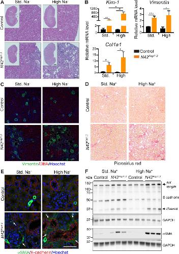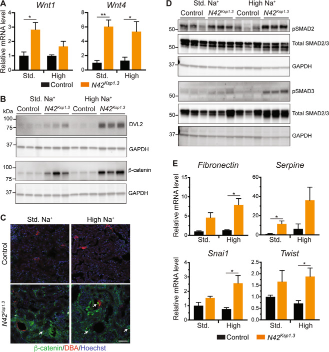 Fig. 7. Low dietary Na+ ameliorates Wnt/β-catenin/TGF-β signaling and kidney disease in Nedd4-2Ksp1.3 mice.Mice were fed a low Na+ (0.05%) diet for 17 days. A Immunoblot analysis of DVL2, β-catenin, pSMAD2/3, and total SMAD2/3 with GAPDH as loading controls. B Immunostaining of αSMA (green) with E-cadherin (red), β-catenin (green) with DBA (red), and vimentin (green) with DBA (red). DNA is stained by Hoechst (blue). Scale bar: 50 μm. C qRT-PCR analysis of genes relative to TBP. D Water intake and urine output over 24 h in metabolic cages. E Haematoxylin and Eosin staining of kidneys, scale bar: 100 μm, 1 mm for inset. F GFR calculated from 24 h urine and blood collection, and serum creatinine and urine levels. Data presented as means ± SEM and significance determined using unpaired two-tailed Student’s t test, n = 3-4. *P < 0.05.