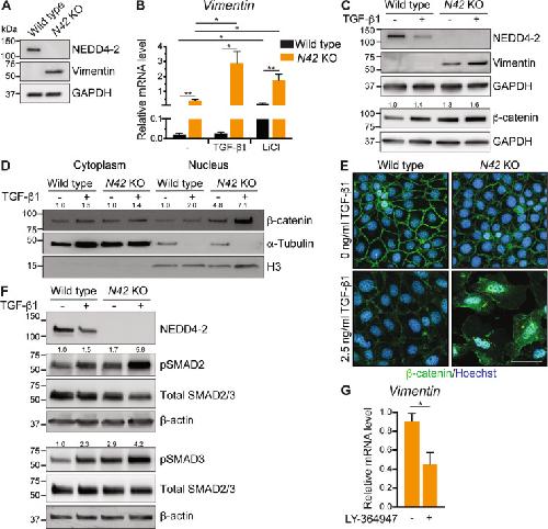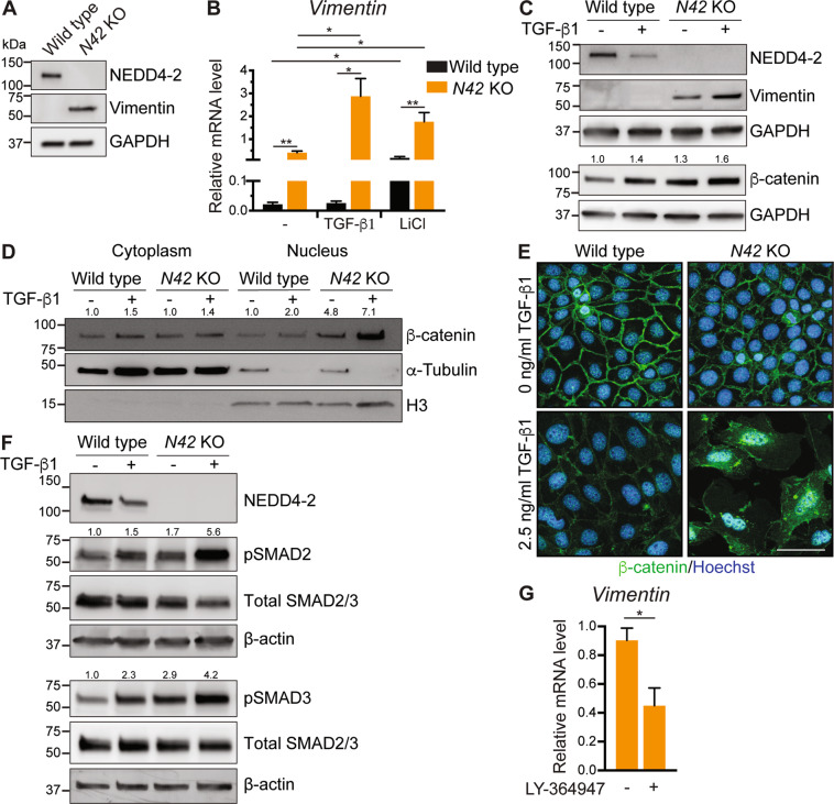 Fig. 5. NEDD4-2 is implicated in Wnt/β-catenin/TGF-β signaling in CCD cells.CRISPR–Cas9 was used to generate CCD-N21 clones lacking NEDD4-2 or wild-type control clones. A Immunoblot analysis of NEDD4-2 and Vimentin with GAPDH as a loading control. B qRT-PCR analysis of Vimentin relative to TBP in untreated cells, 2.5 ng/ml TGF-β1 or 10 mM LiCl treated for 72 h, n = 4 for 4 independent clones each. C Immunoblot analysis of NEDD4-2, vimentin, and β-catenin with GAPDH as a loading control, untreated or after 72 h TGF-β1 stimulation. Numbers indicate quantitation of β-catenin bands relative to untreated wild type lane, normalized to GAPDH. D Immunoblot analysis of β-catenin after separation of cytoplasmic (marked by α-tubulin) and nuclear (marked by Histone 3, H3) fractions. Numbers indicate quantitation of β-catenin bands relative to untreated wild-type lane, normalized to α-tubulin for a cytoplasmic fraction or H3 for nuclear fraction. E Immunostaining of β-catenin (green) with and without TGF-β1 treatment. DNA is stained by Hoechst (blue). Scale bar: 50 μm. F Immunoblot analysis of pSMAD2/3 and total SMAD2/3 with GAPDH as a loading control. Numbers indicate quantitation of pSMAD bands relative to untreated wild-type lane, normalized to β-actin. G qRT-PCR analysis of Vimentin relative to TBP in untreated or 72 h 500 nM LY-364947 treated Nedd4-2 KO cells, n = 4. Data presented as means ± SEM (B, G) and significance determined using unpaired two-tailed Student’s t test. *P < 0.05, **P < 0.01. Immunoblots are representative of three experiments with similar results.