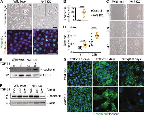 Fig. 6. Nedd4-2 KO CCD cells display EMT characteristics.A Light microscopy of wild type and Nedd4-2 KO cells, scale bar: 200 μm (with higher magnification inset) or immunostaining of vimentin (green) and Phalloidin (red) with Hoechst staining of DNA (blue). Scale bar: 50 μm. B Number of vimentin-positive cells per field of view, n = 4 clones, each with three fields of view. C Light microscopy of cells showing migration distance after scratch, scale bar: 200 μm. D Migration distance quantitated in four clones, n = 3 replicates each. E Immunoblot analysis of N-cadherin with GAPDH as a loading control, untreated or after 72 h 2.5 ng/ml TGF-β1 stimulation. Numbers indicate quantitation of N-cadherin bands relative to untreated wild-type lane, normalized to GAPDH. F Immunoblot analysis of E-cadherin with β-actin as a loading control, untreated or after 3 or 6 days of TGF-β1 stimulation. Numbers indicate quantitation of E-cadherin bands relative to untreated wild type lane, normalized to β-actin. G Immunostaining of E-cadherin (green) after 0, 3, and 6 days of TGF-β1 treatment. DNA is stained by Hoechst (blue). Scale bar: 50 μm. Data presented as means ± SEM (B, D) and significance determined using unpaired two-tailed Student’s t test. ****P < 0.0001.